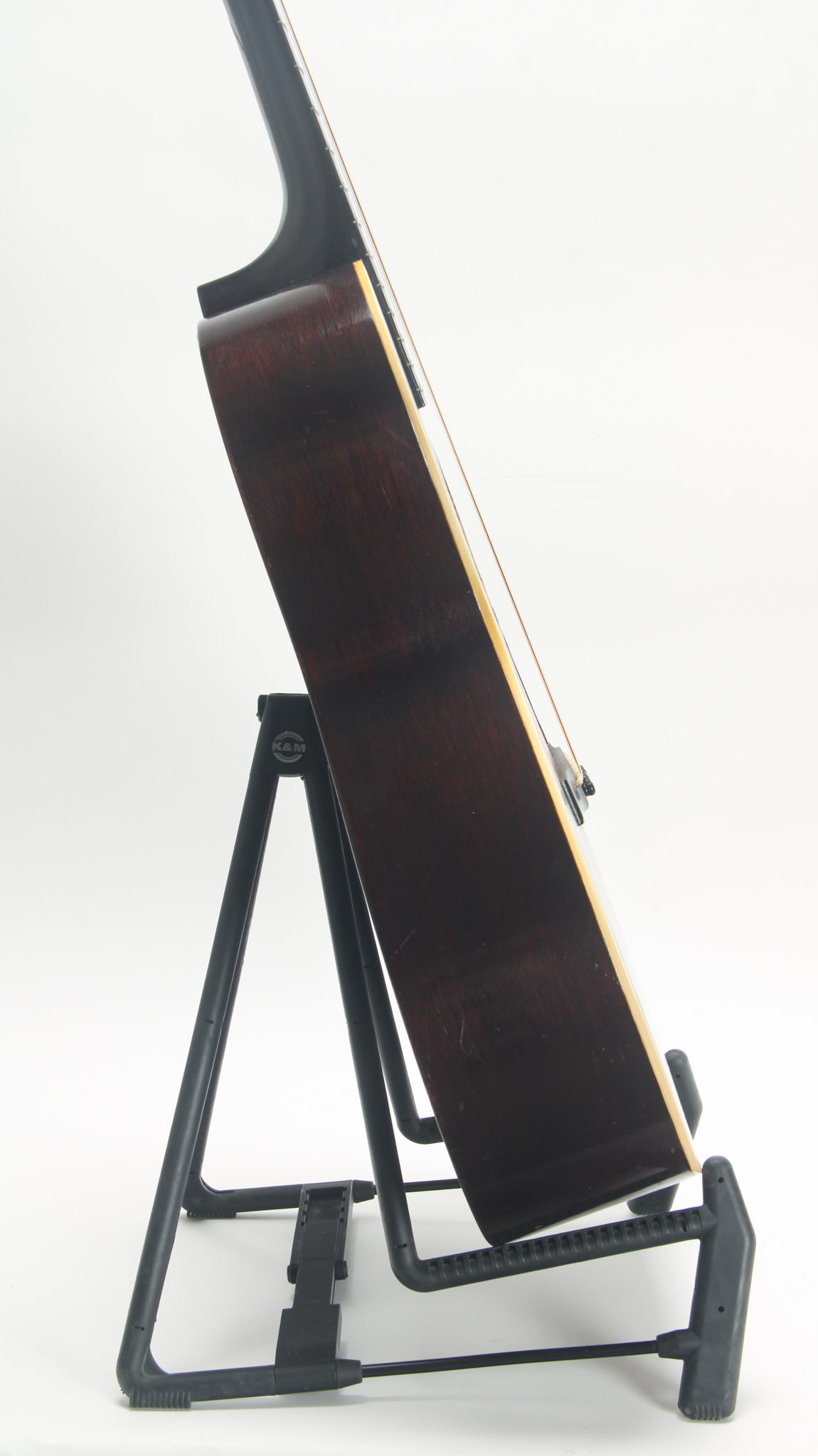 The lower bout on this example measures an expected 14 5/8" across, with a depth of 4 1/4" at the bottom and 3 3/8" at the neck joint. Internally, this guitar features a scalloped X bracing pattern and solid kerfing. The neck on this example is nice and straight with the original frets still present with very mild wear mostly in the cowboy chord positions. The rosewood fingerboard is nice and even and the MOP dot inlay still well seated. The action measures 7/64" on the sixth string at the twelfth fret, and about 5/64" on the first string. Plenty of saddle height, there is about 8/64" of saddle available above the slot. This guitar has a 1 3/4" nut width, and the neck sports an expected V profile. It measures about 1" thick at the first position and about 1.2" at the twelfth. It stays in tune nicely with the original 3x3 plate tuners and buttons present.