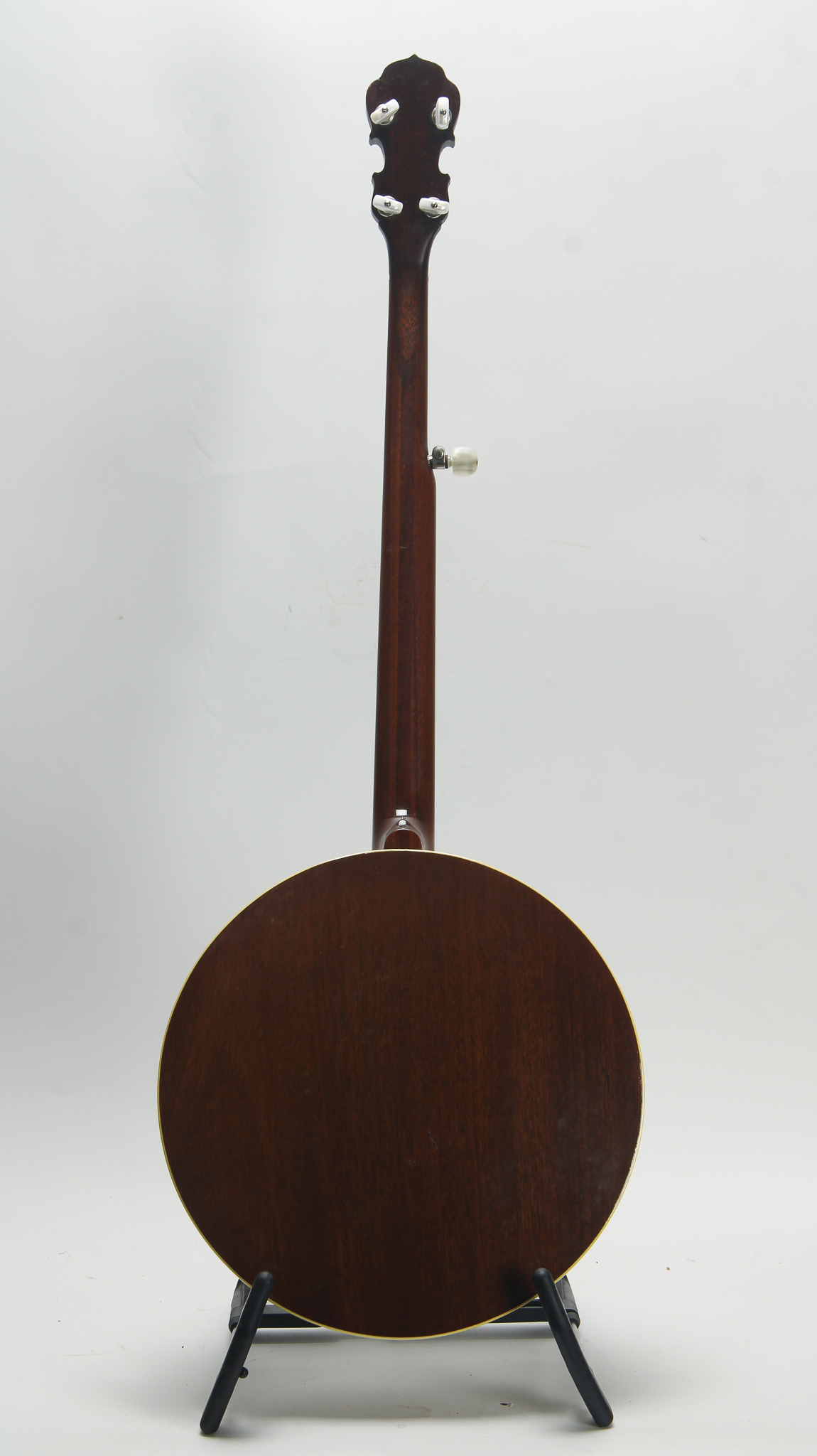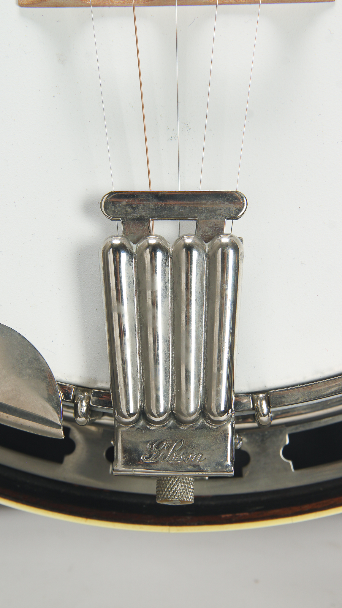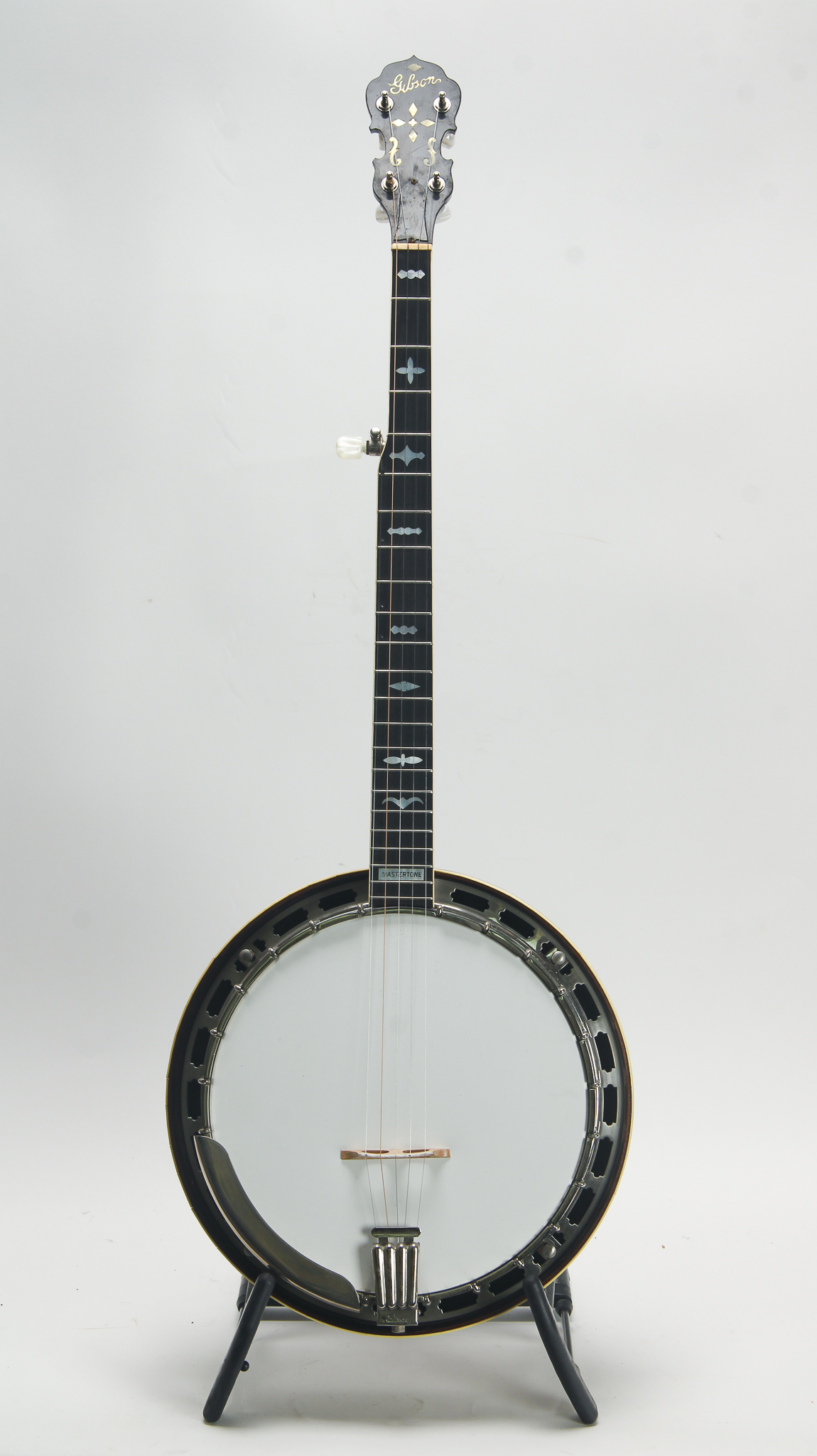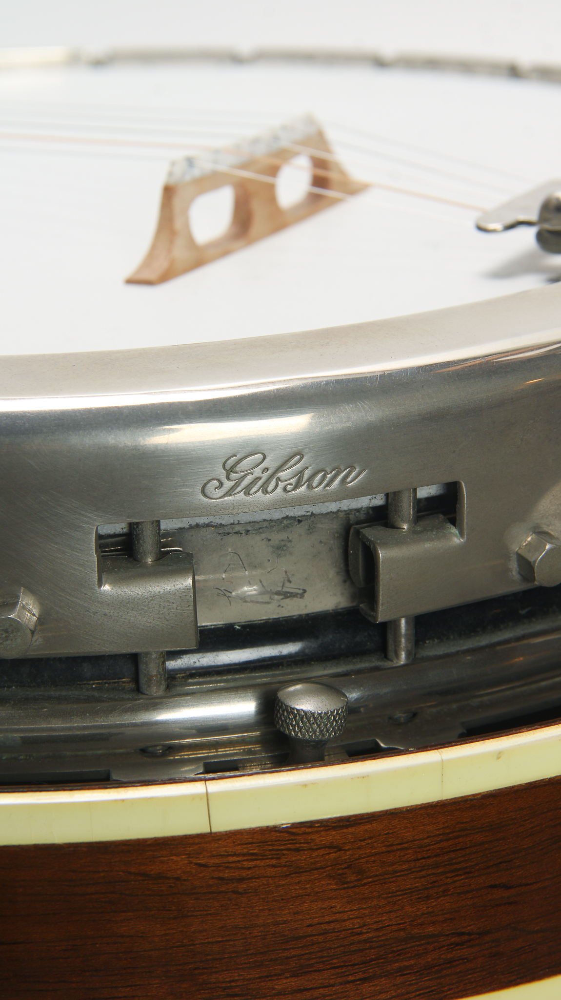 The Gibson Regular Banjo/Resonator Banjo series is an iconic one for Bluegrass history, having been a staple instrument in the genre. This is a nice deal for a well aged banjo - having had a past headstock repair. While the repair yields no serial number currently, it is a nice player - more below. Full thickness 5 ply rim painted in black, nickel-plated metal parts (one piece flange, tension hoop, armrest). It has the standard flathead 20 hole tone ring. The original mahogany resonator is present, full bound with some splits in the binding. Original Gibson stamped tailpiece, all original hooks/nuts. Two internal coordinating rods, fully functional with a nice neck angle for easy bluegrass playability. Upgraded bridge with corian top. The neck has a standard 26.25" five-piece maple neck with 1.25" nut width. The original frets appear in good shape, the ebony fingerboard in good shape with well kept bowtie inlay, and three added rail road spikes. The fiddle peg head overlay complete with script Gibson logo in good shape with some light finish wear around the pearl. Original Five Star tuners are present. It is missing its serial number stamp behind the headstock - due to a repair long ago as explained by the original owner: "I bought the banjo new from a mom and pop music store in Shrewsbury, MA around 1975-76. That was my main axe until I got my first Stelling. That banjo accompanied me for a few months backpacking in Europe. Somewhere in Italy the neck cracked near the handstop on the back of the neck just above the nut. (I discovered it, to my horror, while serenading 2 young attractive Italian girls in the Piazza San Marco. (They requested "Teach Your Children".) Upon returning, the neck was repaired by Sandy Sheehan in Cambridge. He was the man to go to back then. I believe that he did what he called a "backstrapping" repair." Sonically this build is very impressive - with a straight neck and a nice robust and punchy tone these banjos are known for. Includes original hardshell case - complete with a bit of a "vintage" smell.
