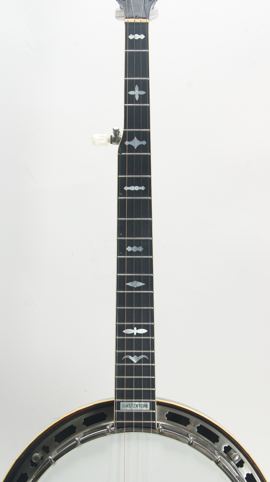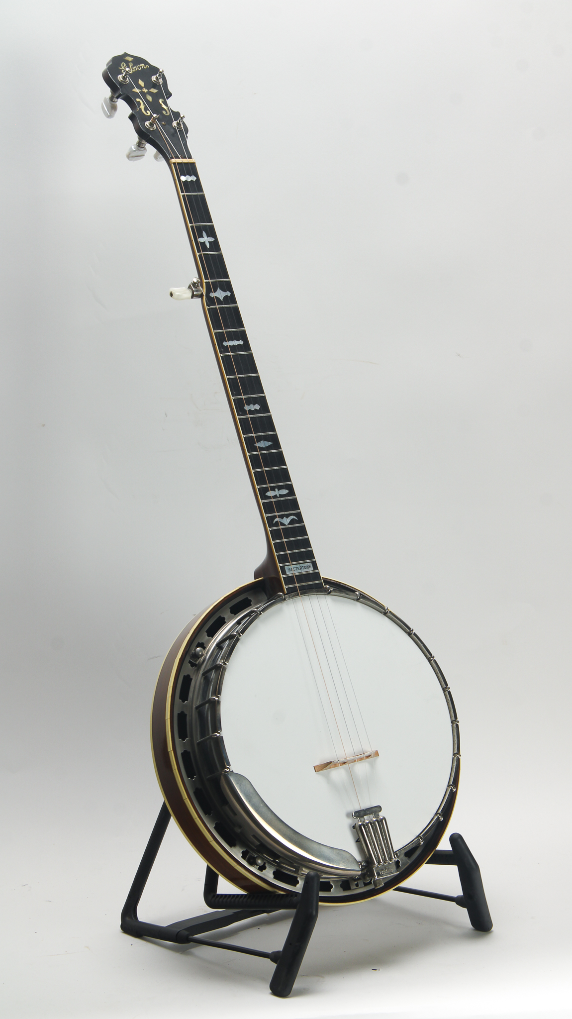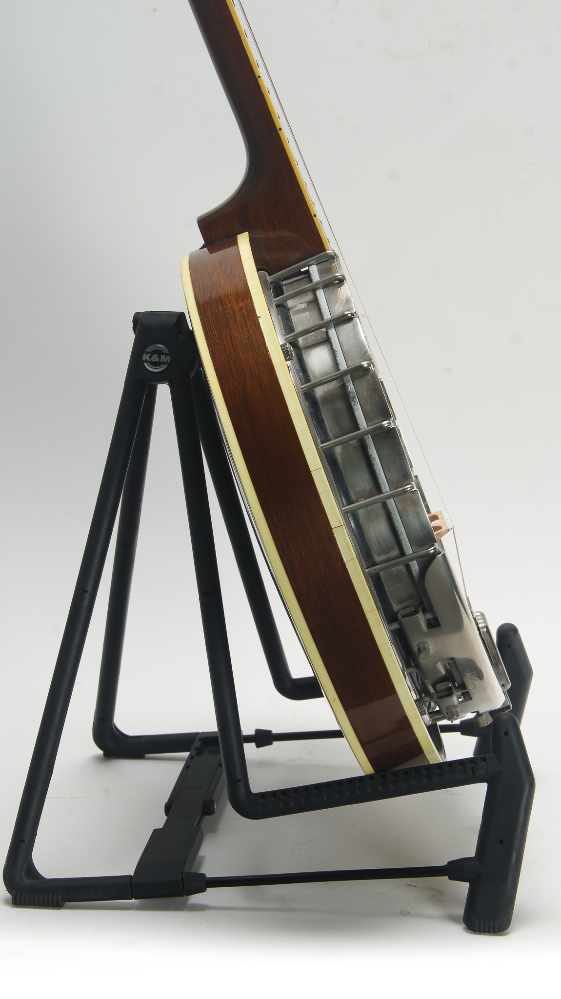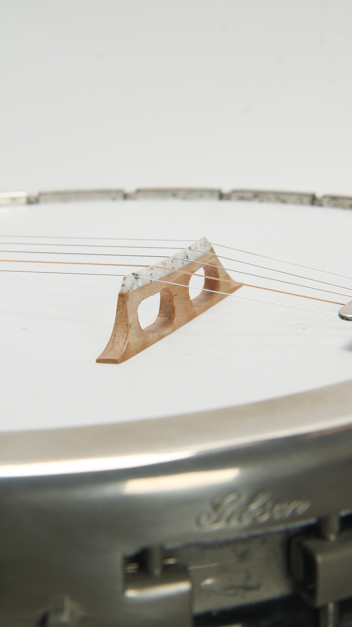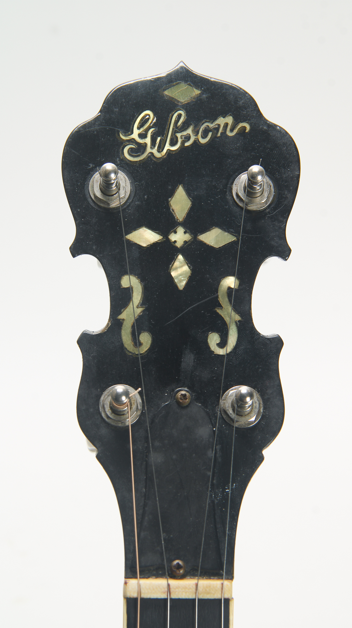 The Gibson Regular Banjo/Resonator Banjo series is an iconic one for Bluegrass history, having been a staple instrument in the genre. This is a nice deal for a well aged banjo - having had a past headstock repair. While the repair yields no serial number currently, it is a nice player - more below. Full thickness 5 ply rim painted in black, nickel-plated metal parts (one piece flange, tension hoop, armrest). It has the standard flathead 20 hole tone ring. The original mahogany resonator is present, full bound with some splits in the binding. Original Gibson stamped tailpiece, all original hooks/nuts. Two internal coordinating rods, fully functional with a nice neck angle for easy bluegrass playability. Upgraded bridge with corian top. The neck has a standard 26.25" five-piece maple neck with 1.25" nut width. The original frets appear in good shape, the ebony fingerboard in good shape with well kept bowtie inlay, and three added rail road spikes. The fiddle peg head overlay complete with script Gibson logo in good shape with some light finish wear around the pearl. Original Five Star tuners are present. It is missing its serial number stamp behind the headstock - due to a repair long ago as explained by the original owner: "I bought the banjo new from a mom and pop music store in Shrewsbury, MA around 1975-76. That was my main axe until I got my first Stelling. That banjo accompanied me for a few months backpacking in Europe. Somewhere in Italy the neck cracked near the handstop on the back of the neck just above the nut. (I discovered it, to my horror, while serenading 2 young attractive Italian girls in the Piazza San Marco. (They requested "Teach Your Children".) Upon returning, the neck was repaired by Sandy Sheehan in Cambridge. He was the man to go to back then. I believe that he did what he called a "backstrapping" repair." Sonically this build is very impressive - with a straight neck and a nice robust and punchy tone these banjos are known for. Includes original hardshell case - complete with a bit of a "vintage" smell.