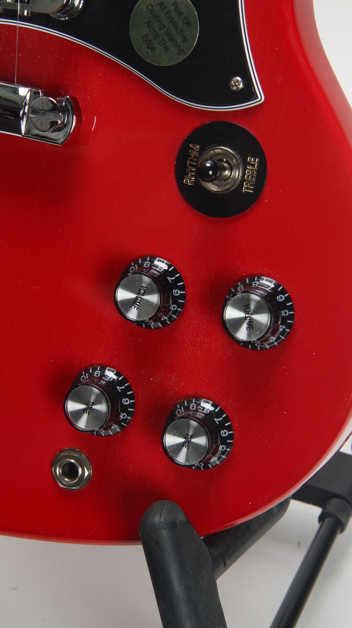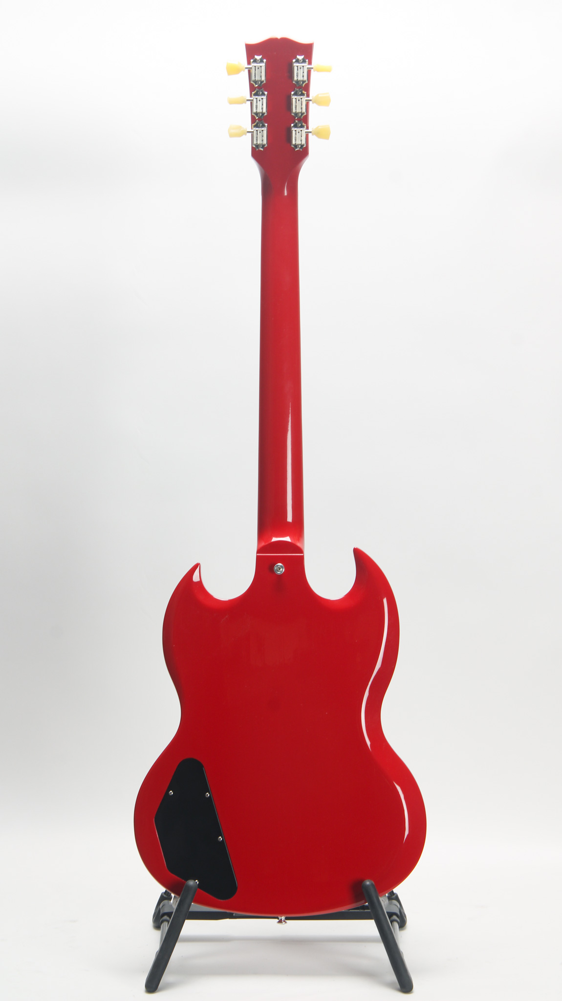 This guitar dates accurately to 2011 with virtually no play wear, retaining the protective pickguard plastic - but shows light cosmetic checking throughout its finish in the neck. Light low action measuring 5/64" in height at the twelfth fret with a straight neck yields a great rock n roll machine - suitable for any player from R&B to Metal. Unique blackened Obeche fingerboard has a bit of a maple feel to it. The neck measures a comfortable .86" in thickness at the first position and tapers to about .98" at the twelfth, with a standard 1 11/16" nut width. Kluson deluxe tuners present and functional.