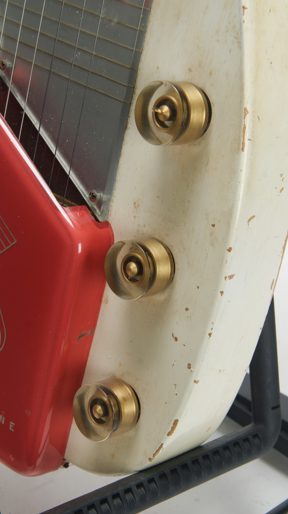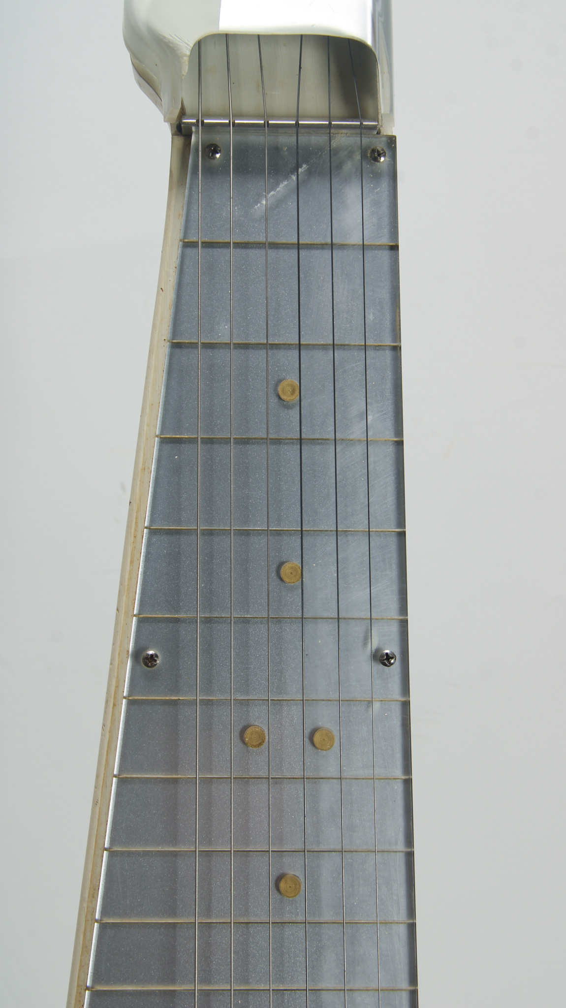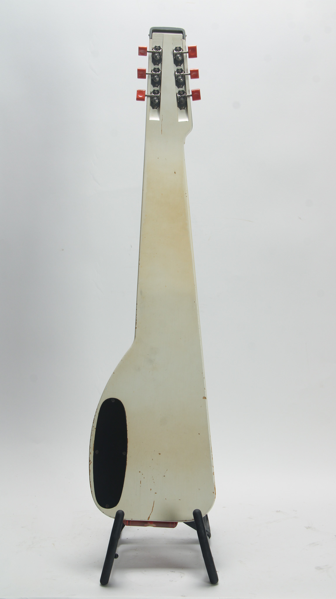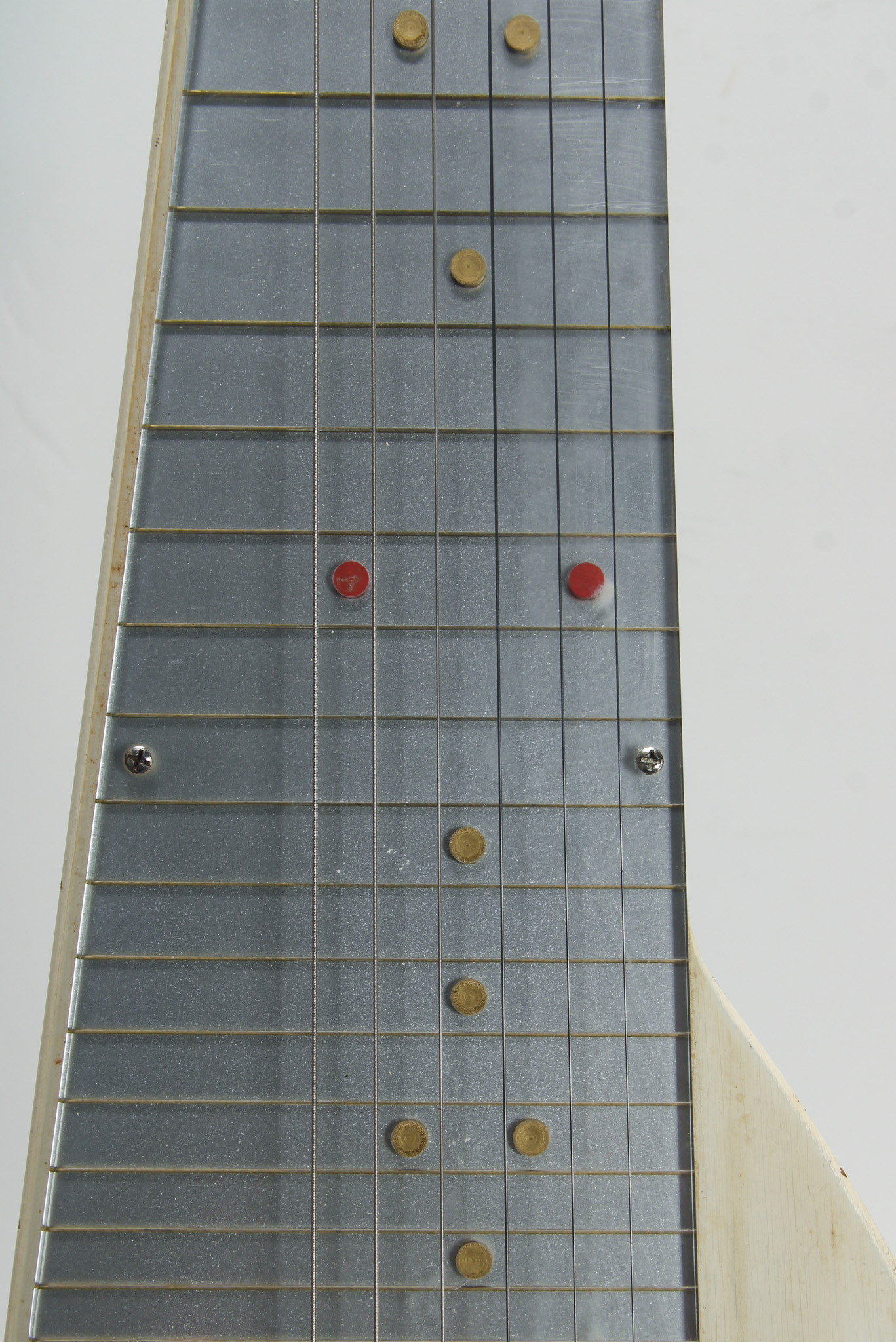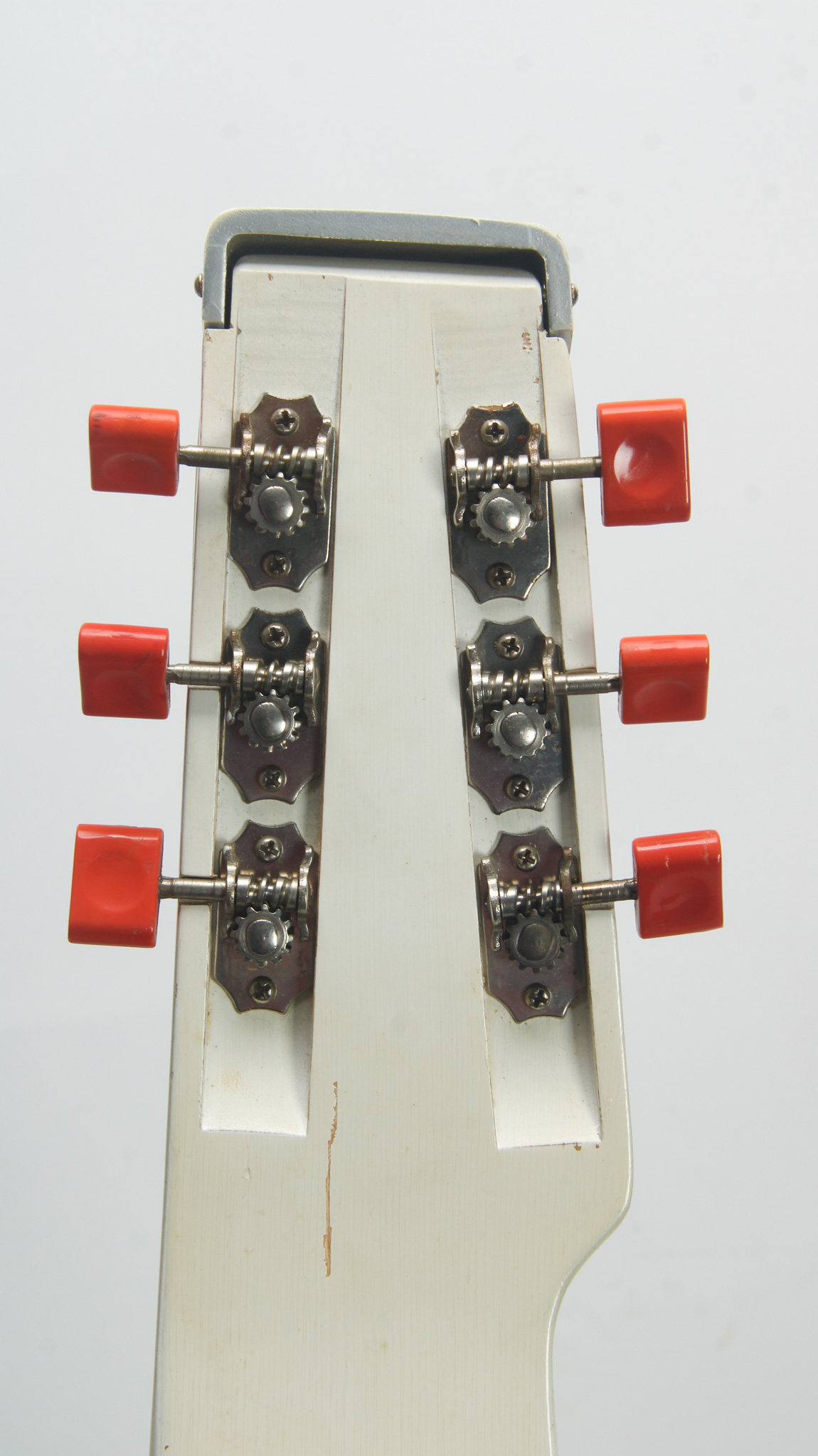 This example features the white finish on the maple body, no binding, with lucite fingerboard, unique coral pickup cover with integrated output jack and lyre embellishments. Checking and light wear the finish, but overall a clean example with no structural issue. with Equipped with original tuners w/ original coral chicklett buttons in strong shape, and P90 pickup. Original Solar tone cap and pots present - one might consider a recap as the sweep as not quite as fluent for some modern playing.