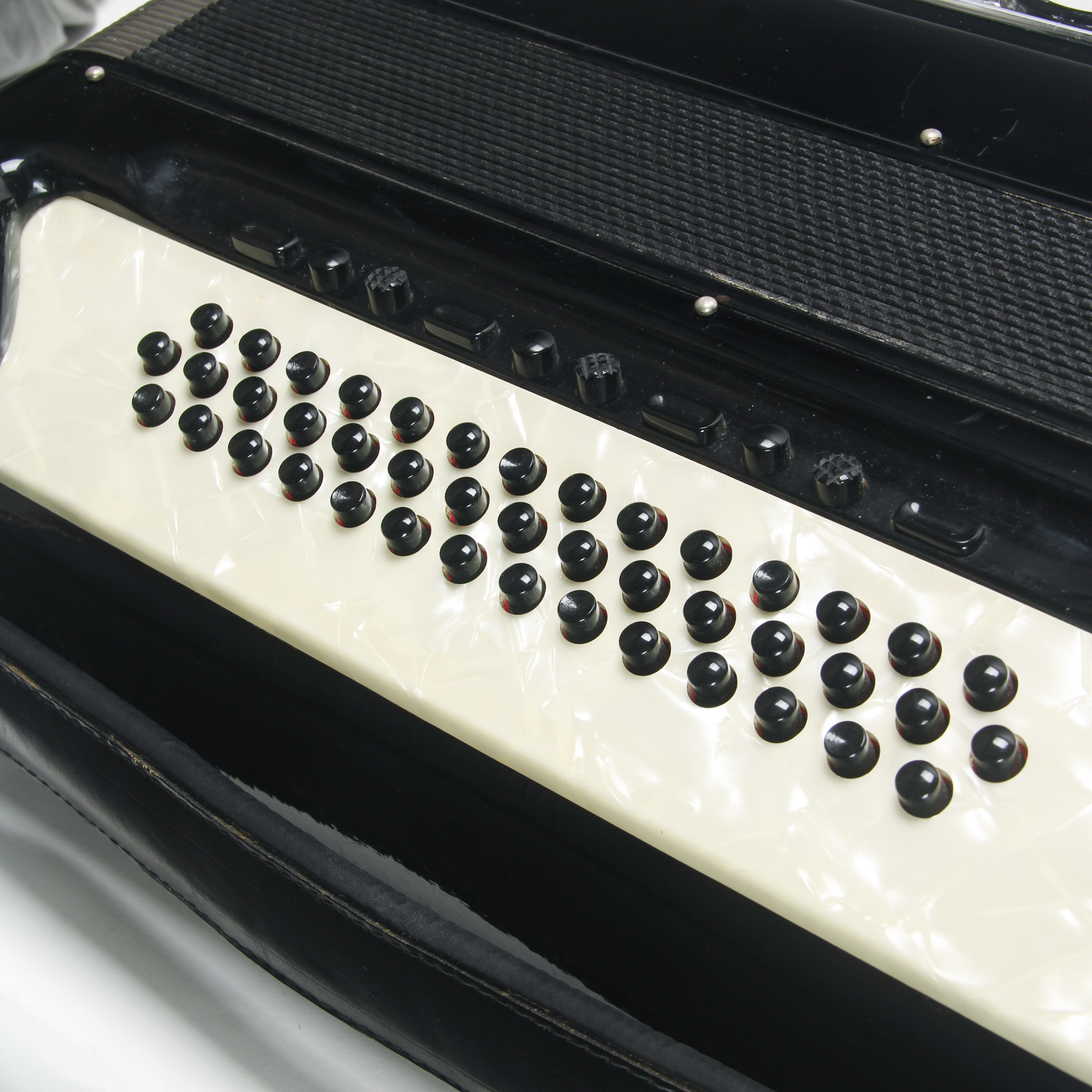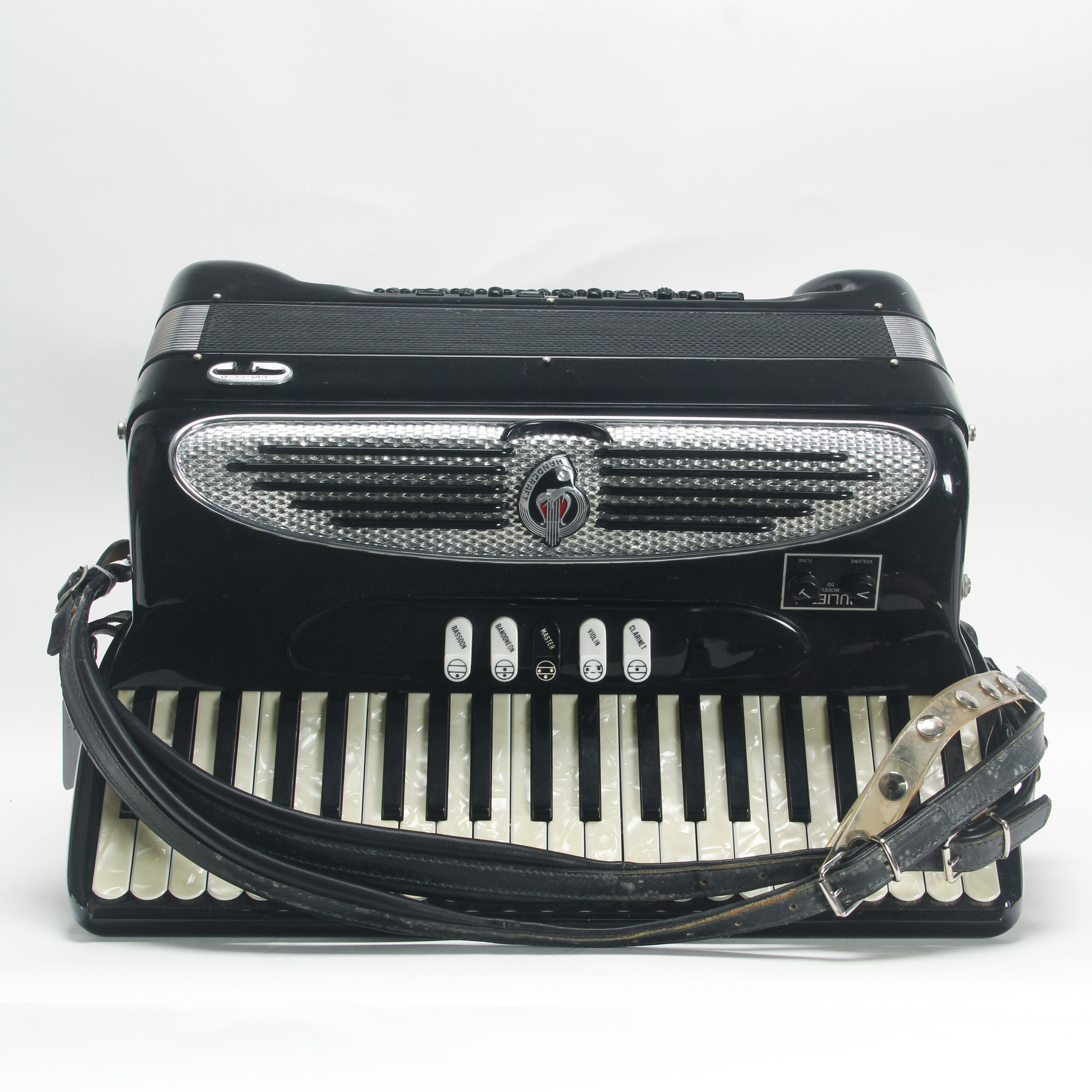 This Giulietti Bassetti F3 accordion in gloss black is in very good, playable condition. This model has a pickup system installed. The cover plate around the tone and volume knobs reads Model 50. The accordion has 43 bass buttons and 10 switches above. There are 41 keys and 5 voicing switches on the treble side. Made in Italy.