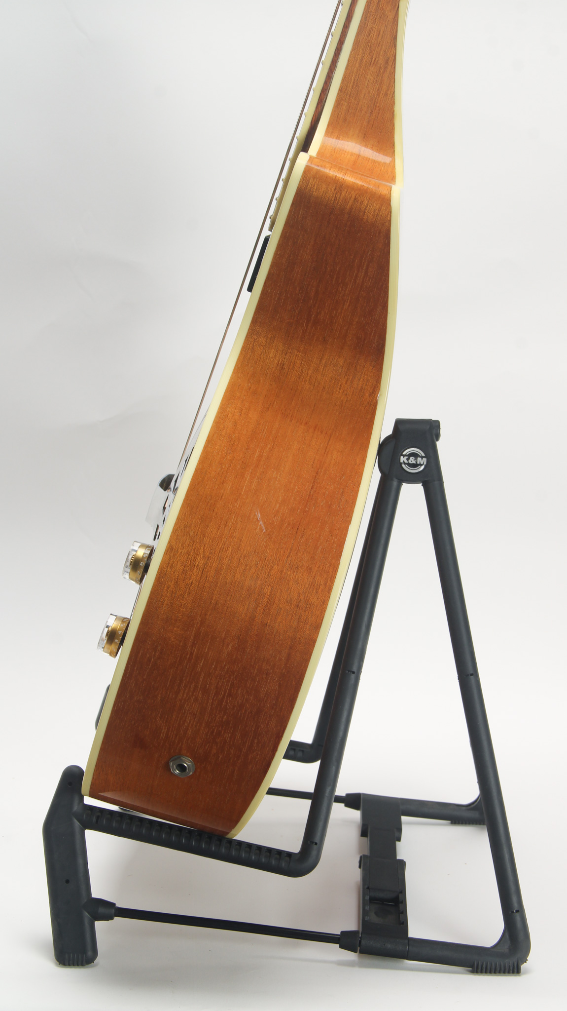 The body is constructed with mahogany, with a large 16 1/8" lower bout - equipped with a spider cone (with two vents at its upper bout). This guitar has an inventive and thoughtful back and side design - the back curving nearly like a Bowlback - with a depth of 3 7/8" at the base - narrowing at the neck joint with a depth 1 1/4" at the heel (see photos of the side profile for clarity). The back and sides of non figured mahogany book matched at the center seam. Full bound, it is quite rugged of an instrument, likely finished in high gloss poly - the binding in good shape with some touched up spots present (namely on the back). Single cut away, it allows easier access to the upper registers for Spanish playing style. An old crack is present alongside the bass side of the fingerboard extension which appears sealed and non problematic currently.