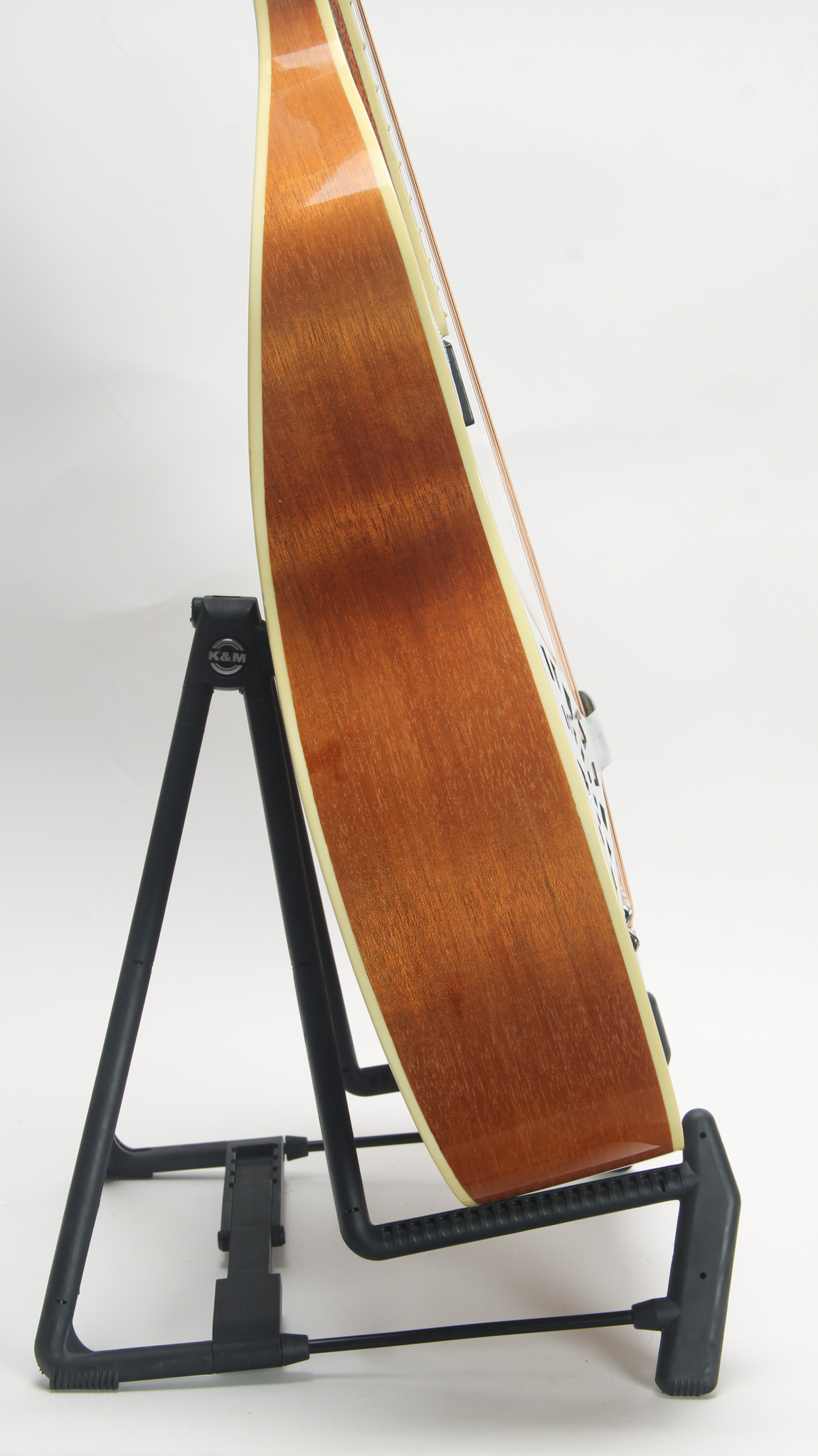 A modern design rooted in tradition - this is quite the fine resonator guitar, truly unlike anything else on the market. It has substantial volume with a balanced tone, complex harmonics, and strong bass. With a unique neck shape, one can approach it as a Squareneck dobro, or play Spanish style - currently setup for the latter with fairly low action, but high enough to enjoy some slide work.