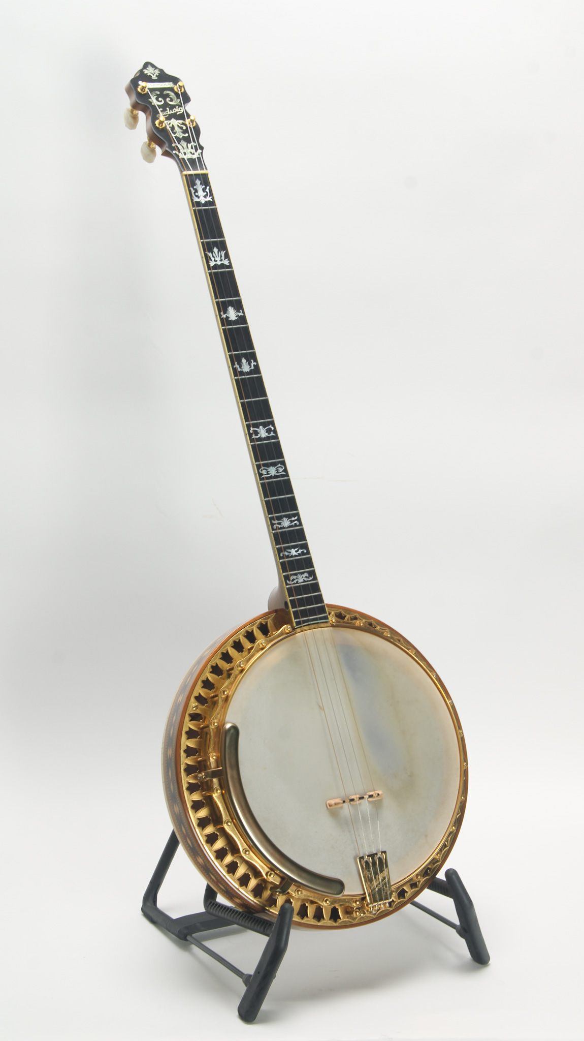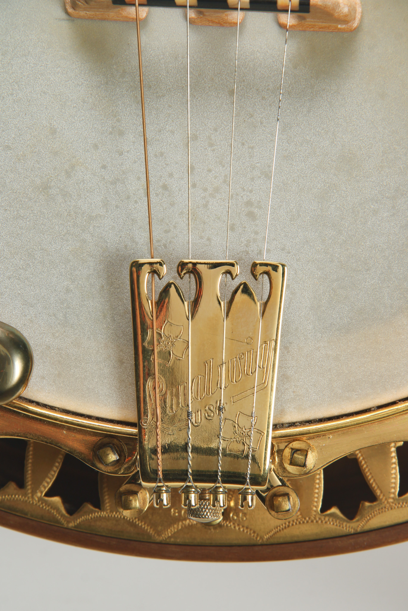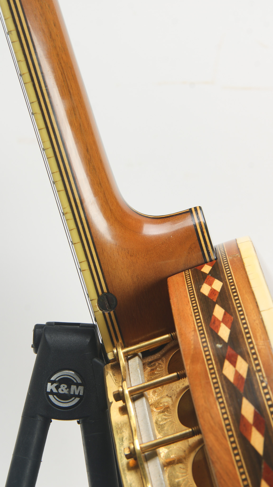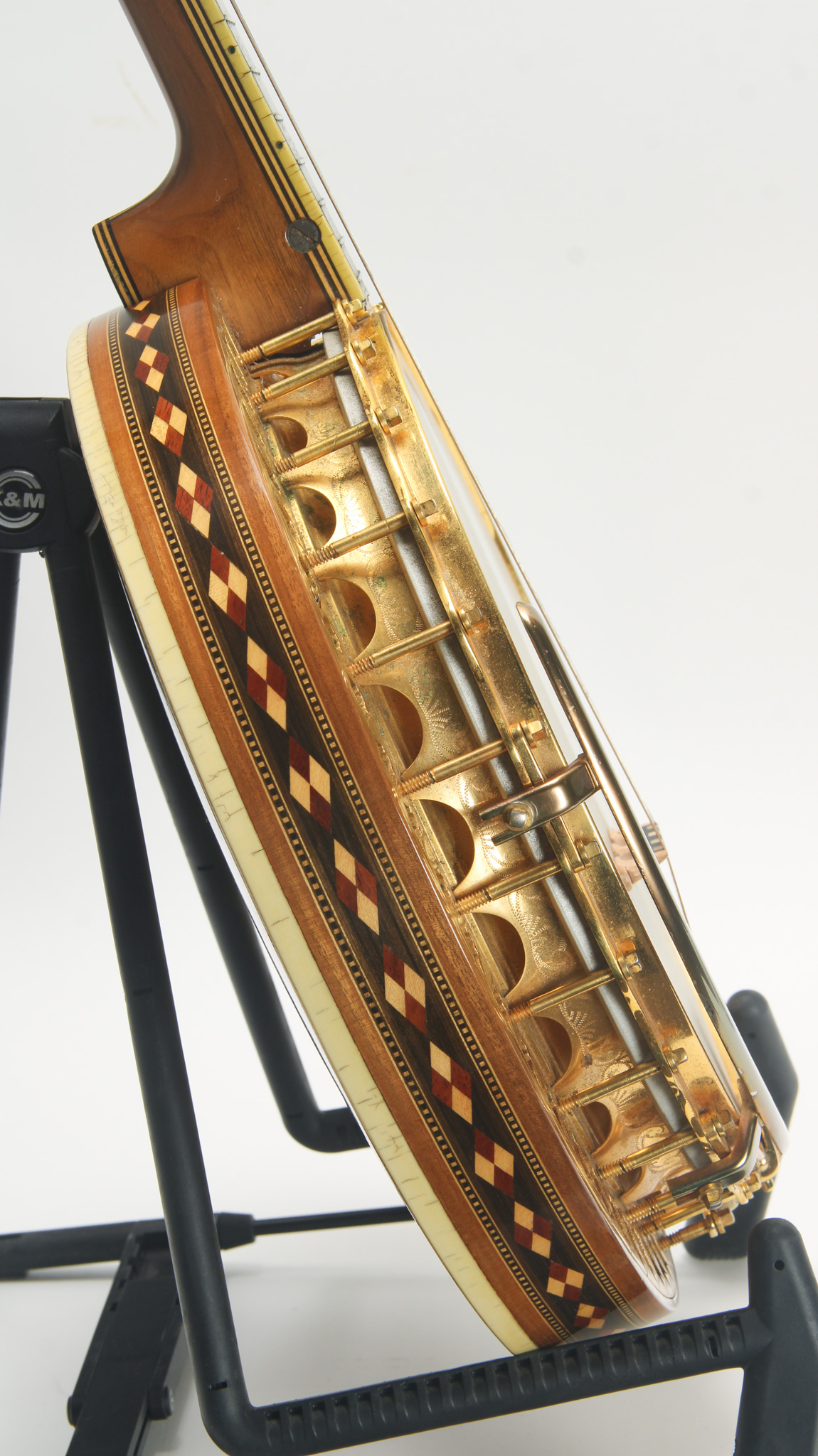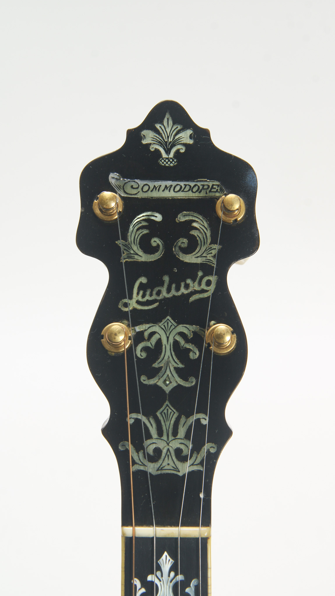Ludwig's Commodore model was the plectrum banjo companion to their Ambassador tenor banjo, showcasing the firms top-tension rim assembly design, and other design and build features such as the cam-style "Banjo Action Regulator", and "Flaredge" rounded tonering design. Nearing 100 years old, this example is sold in its original hard case, held privately in the same collection for over 60 years. The gold plated rim assembly is of heavily gold-plated, hand-engraved, high pressure bronze, with top tensioning system, and original hardware including the armrest, engraved flange with tulip cutouts, neck adjuster, with replated/slightly later tailpiece (original resides in case pocket and was repaired at some point); the multi-ply walnut resonator with grand floral motif in marquetry on the back, back binding, with thick diamonds of colorful inlaid wood on the side between a delicate checkerboard scheme. The 27" scale walnut neck was built with a multi piece center lamination, which is also present beneath the bound ebony fingerboard, and heel cap; finely engraved pearl inlay present on the fingerboard and on peghead with model banner, and Ludwig logo. A finely playing banjo with extremely light neck relief, typical fret wear is present, tarnish on metal plating, with a multitude of hairline cracks on the neck's binding, and some on the ebony fingerboard.