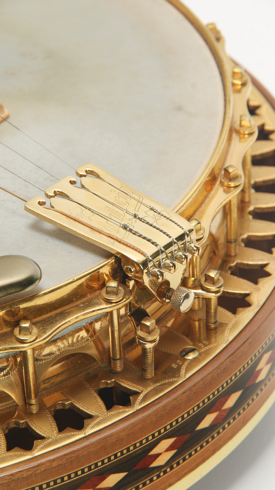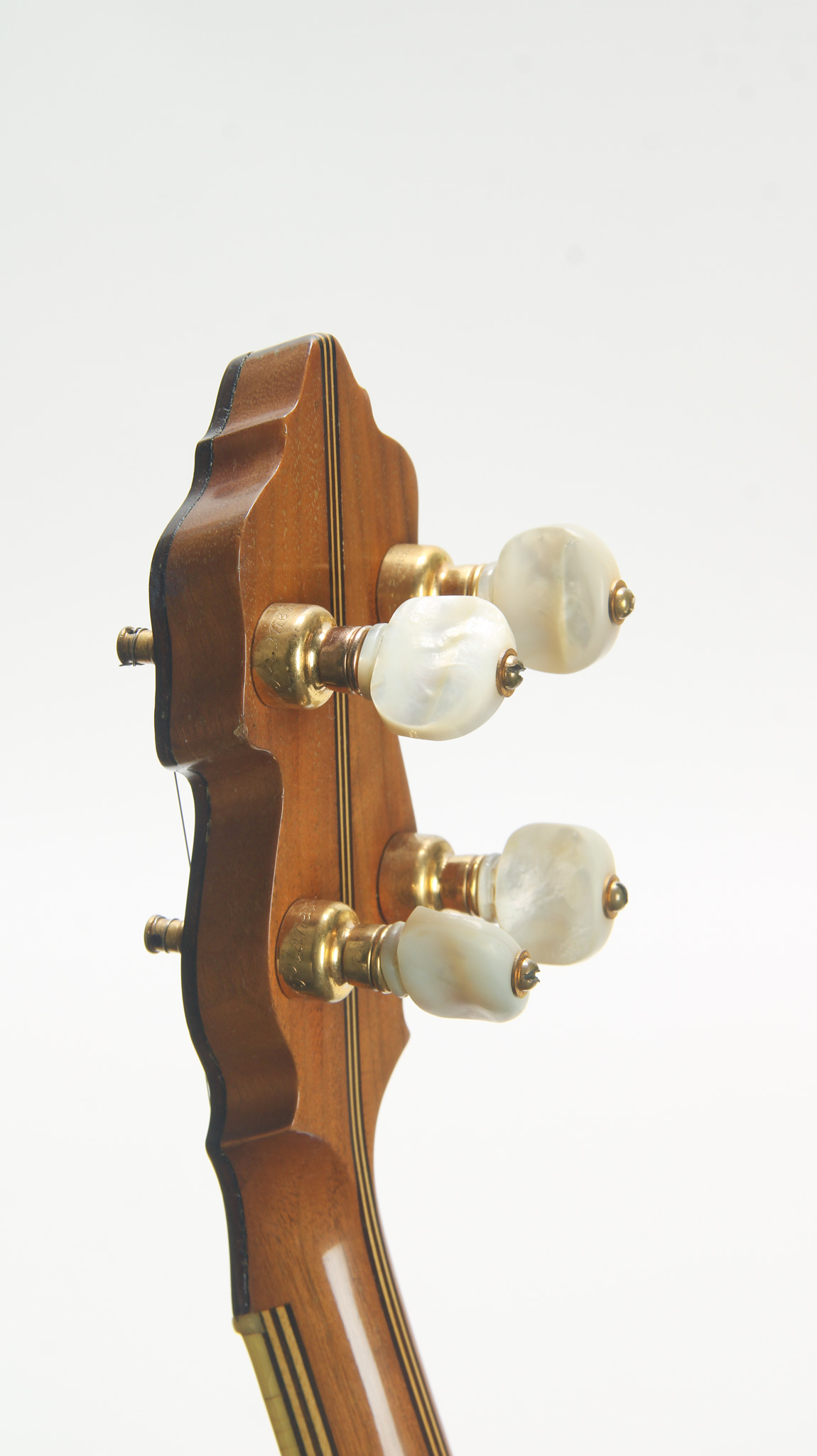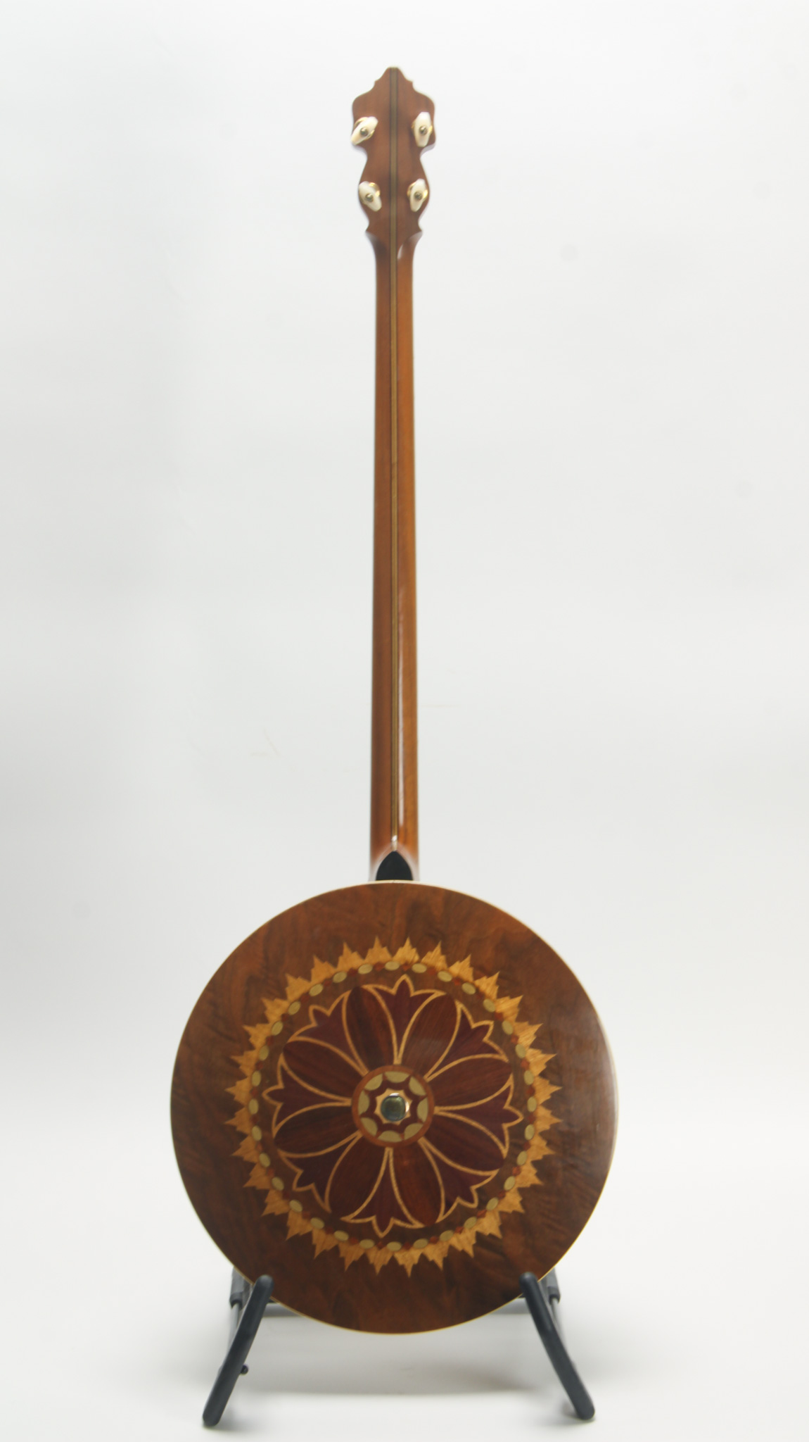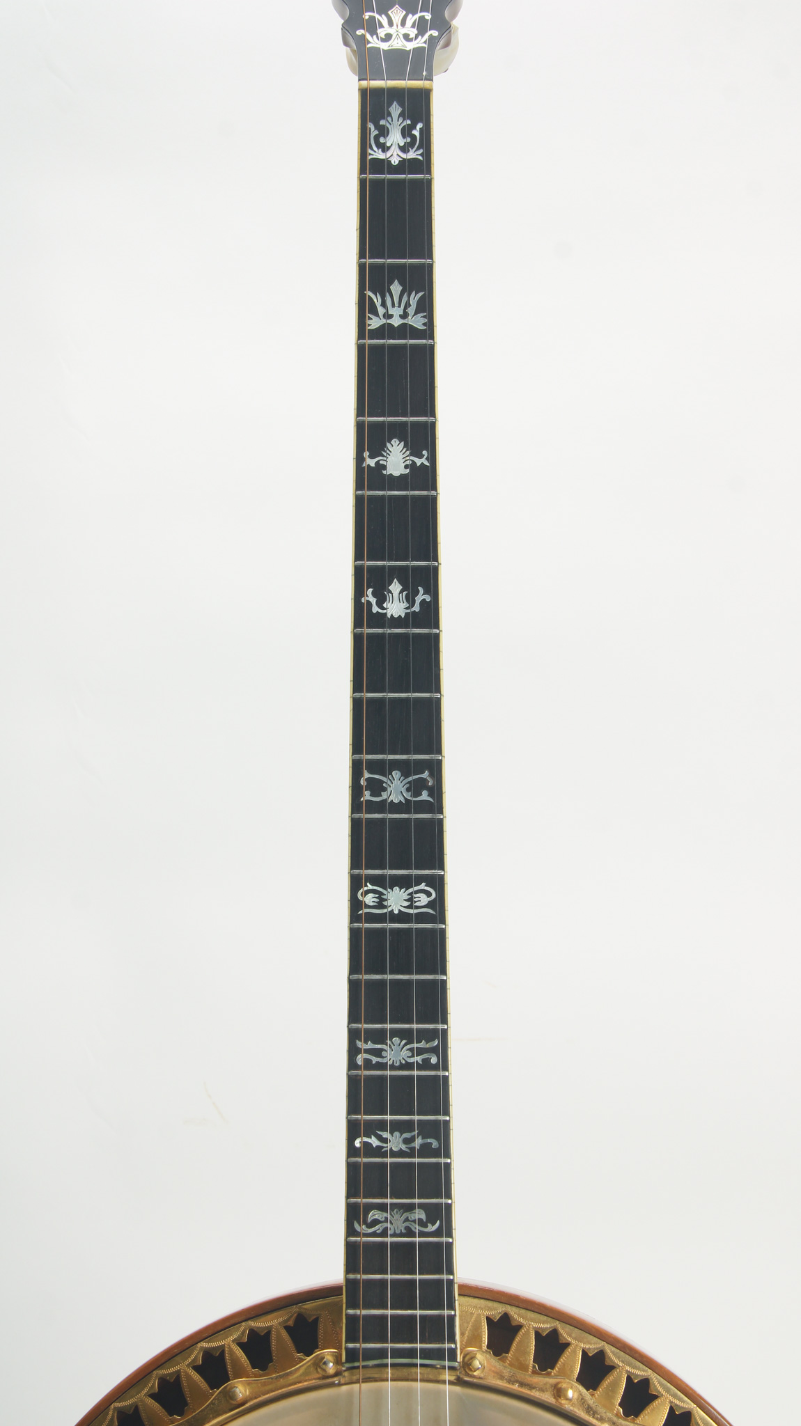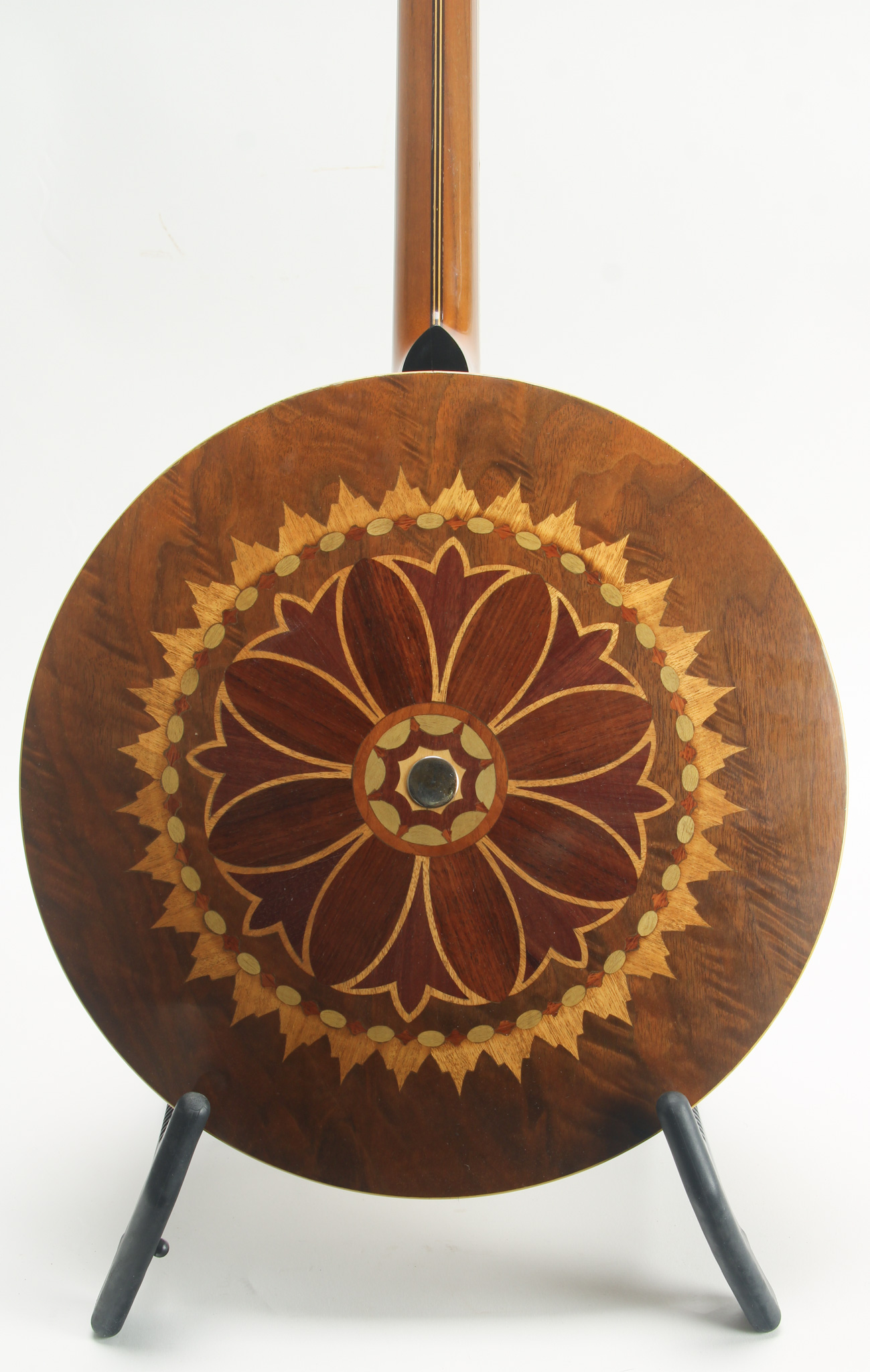 Ludwig's Commodore model was the plectrum banjo companion to their Ambassador tenor banjo, showcasing the firms top-tension rim assembly design, and other design and build features such as the cam-style "Banjo Action Regulator", and "Flaredge" rounded tonering design. Nearing 100 years old, this example is sold in its original hard case, held privately in the same collection for over 60 years. The gold plated rim assembly is of heavily gold-plated, hand-engraved, high pressure bronze, with top tensioning system, and original hardware including the armrest, engraved flange with tulip cutouts, neck adjuster, with replated/slightly later tailpiece (original resides in case pocket and was repaired at some point); the multi-ply walnut resonator with grand floral motif in marquetry on the back, back binding, with thick diamonds of colorful inlaid wood on the side between a delicate checkerboard scheme. The 27" scale walnut neck was built with a multi piece center lamination, which is also present beneath the bound ebony fingerboard, and heel cap; finely engraved pearl inlay present on the fingerboard and on peghead with model banner, and Ludwig logo. A finely playing banjo with extremely light neck relief, typical fret wear is present, tarnish on metal plating, with a multitude of hairline cracks on the neck's binding, and some on the ebony fingerboard.