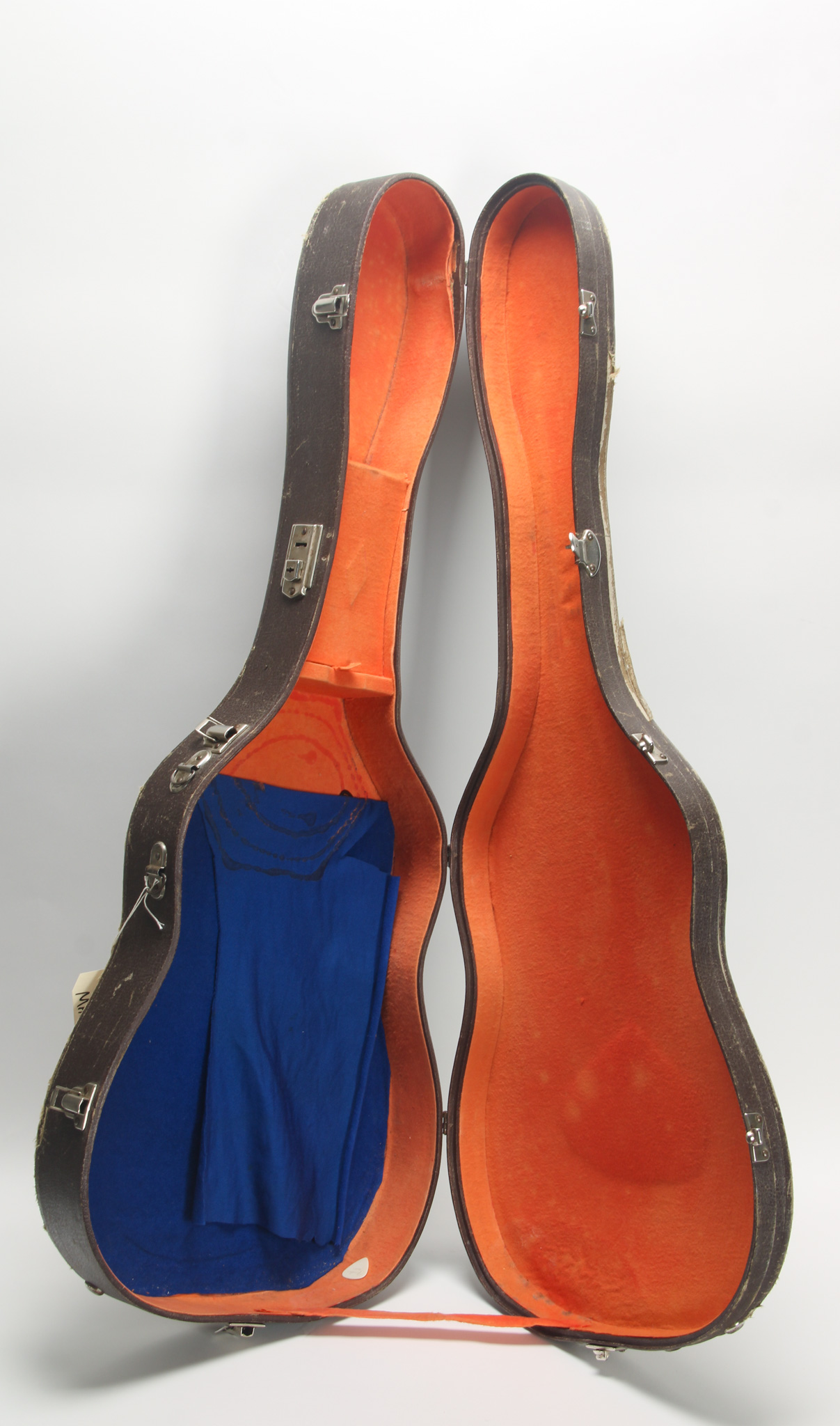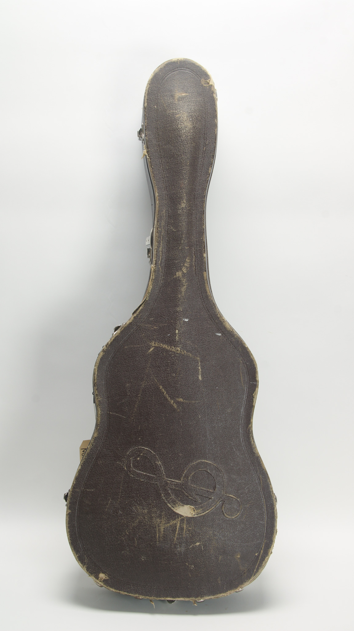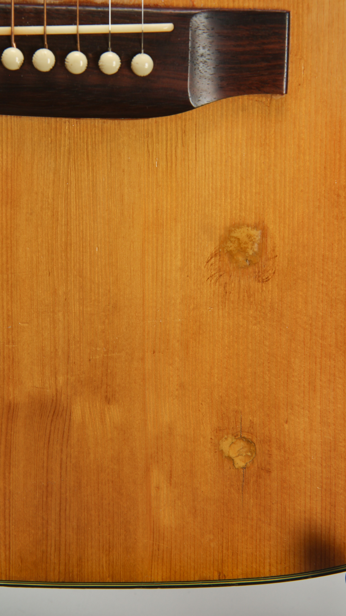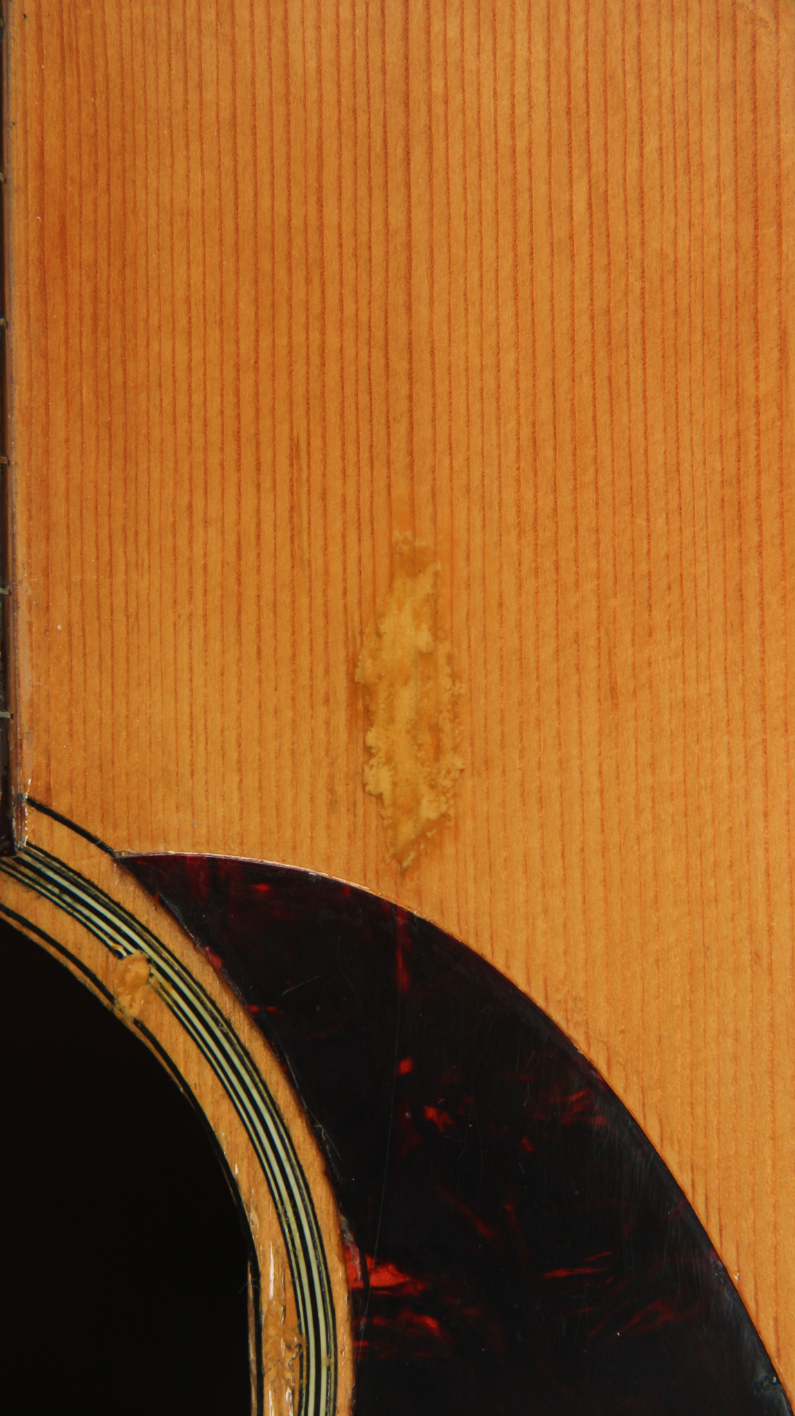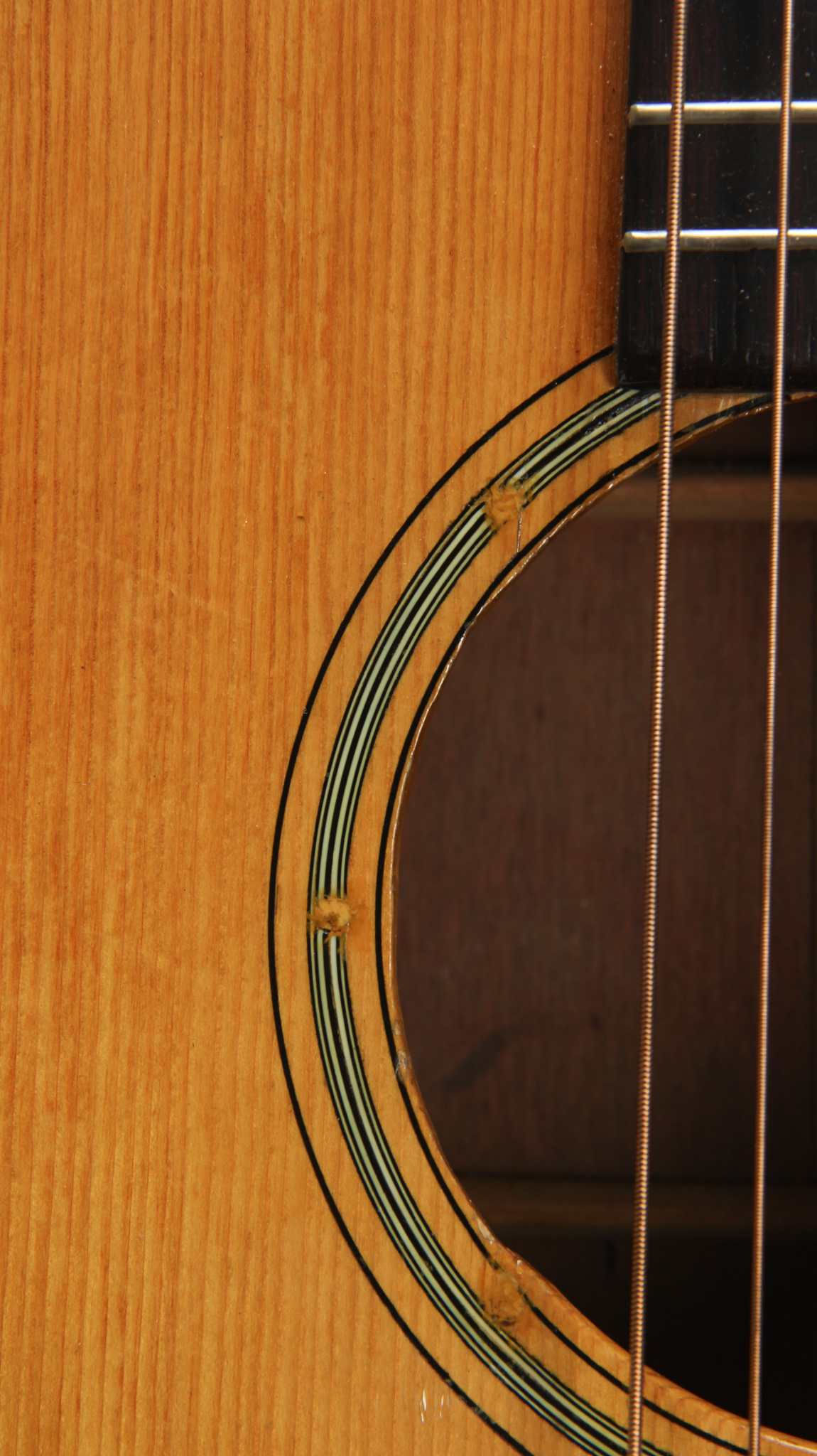 The top is made of fairly tightly grained Spruce, the interior with a rear shifted, scalloped X bracing - original bracing is present, including the thin maple bridge plate. Refinished, the guitar has a thick coat of presumably brushed on poly - which one might consider removing, but it doesn't impede the resonance this guitar has. In its past the guitar had been fitted with a hanger tailpiece. Replaced bridge, it appears accurate nice rosewood, retaining old plastic pins. The top has two plugged holes near its treble side lower bout, utilizing what may have been a stained wood-filler which has held up well. The same process was used at the treble side upper bout near the pickguard to seal a crack. There are a series of small nail holes present in the rosette which have been sealed - with one currently exposing an open crack. The top is very flat, with no belly, the sound hole region is not sinking. The back shows a small center seam separation, held together by the spine. The sides have a repaired hole (likely from an old output jack), as well as a at its bass side lower bout ( what appears to be from an old impact). The original celluloid binding appears in good condition.