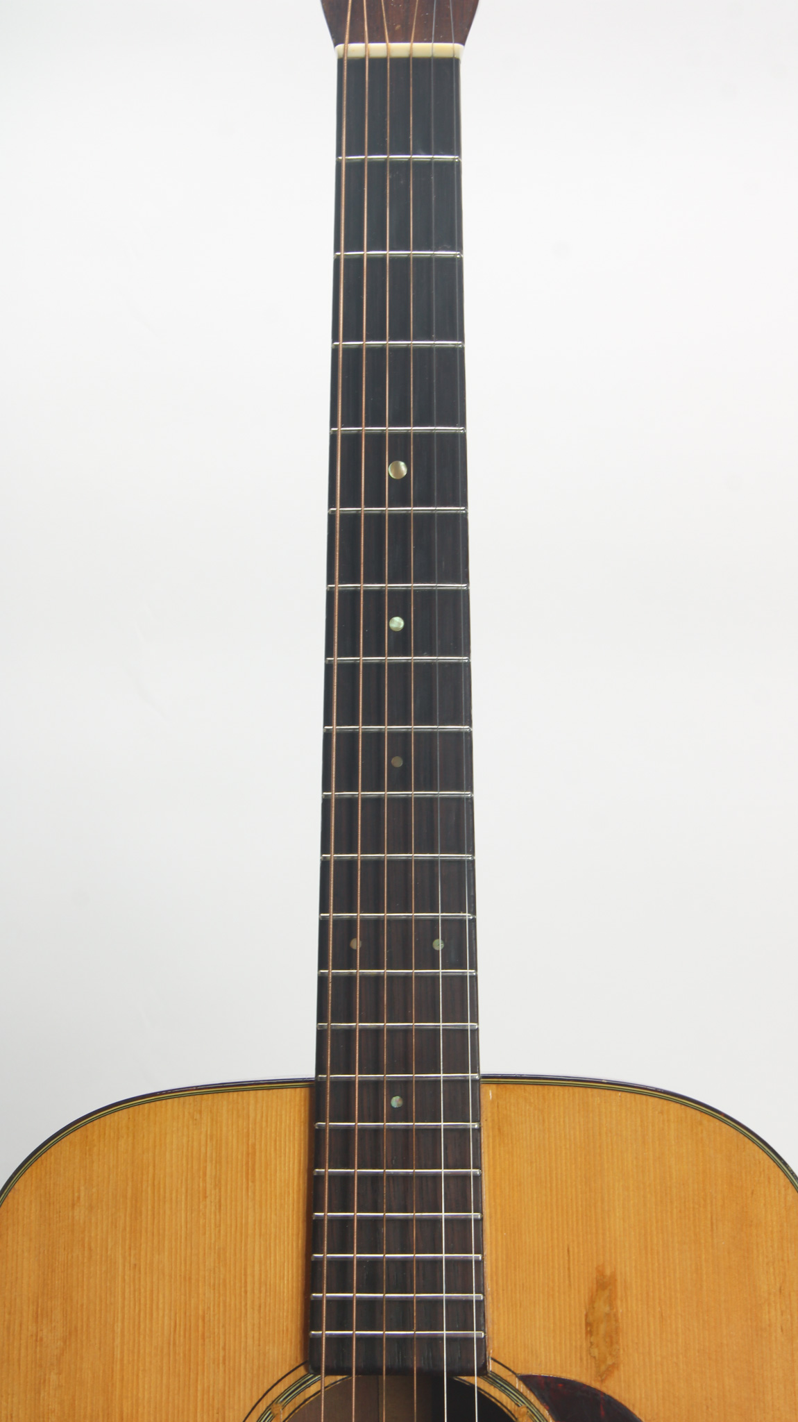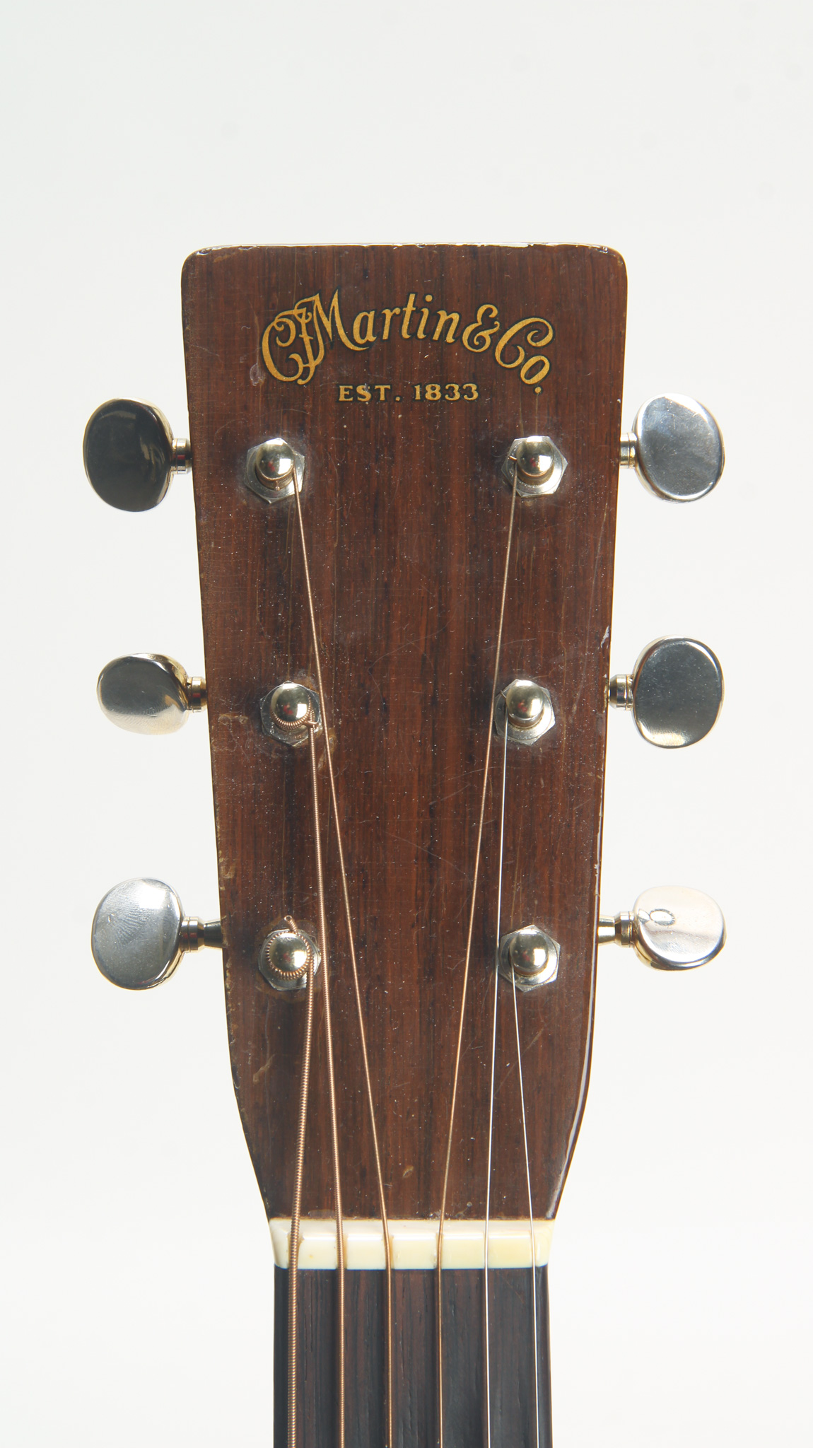 The neck is made of mahogany with a dark rosewood fingerboard, with the 24.9" scale length and a 1 11/16" nut width. It has a thin soft V profile, measuring .81" in depth at the first fret tapering to about .95" at the ninth. It has been refretted, resulting in nice clean vintage size frets, but the fingerboard retains a fair bit of play wear - primarily in the cowboy chord zone (mostly on the 3rd string). While being refinished, it has a very comfortable and smooth feel, the profile clean throughout with a few light dings around the first register. There is evidence of a past neck reset, yielding great playability - the action measuring a standard 6/64" in height at the twelfth fret of the sixth string, and a hair over 4/64" on the first. The old saddle stands tall measuring about 8/64" in height over the slot - a very good neck reset. The tuners have been replaced with an unmarked gold option which function excellent and feel very light weight. The face of the peg head appears untouched retaining what appears to be the original Martin logo.