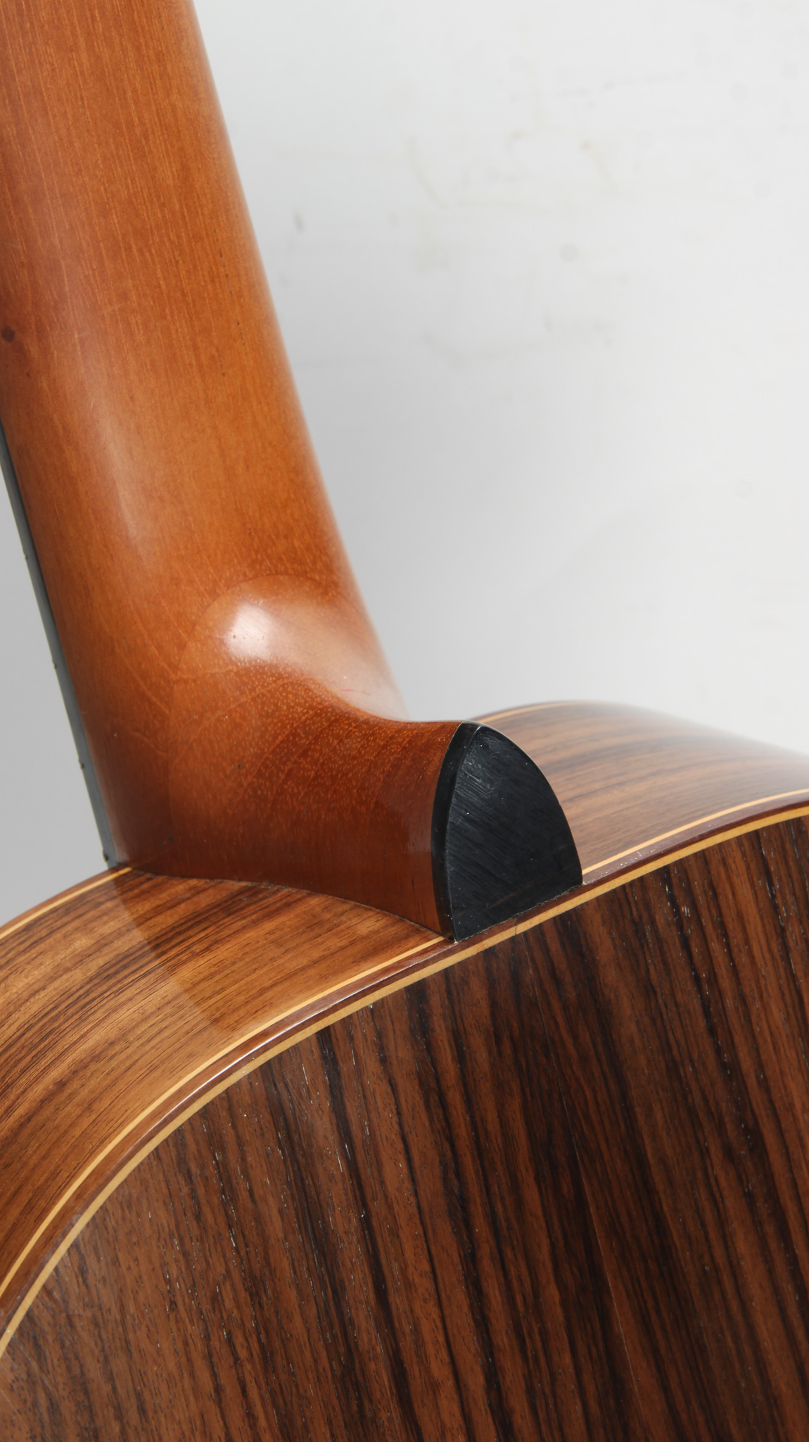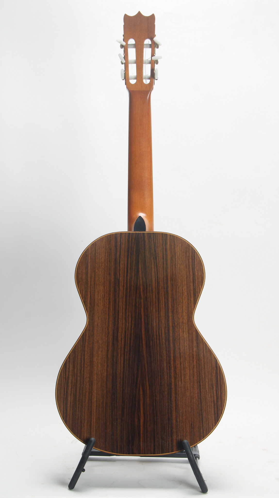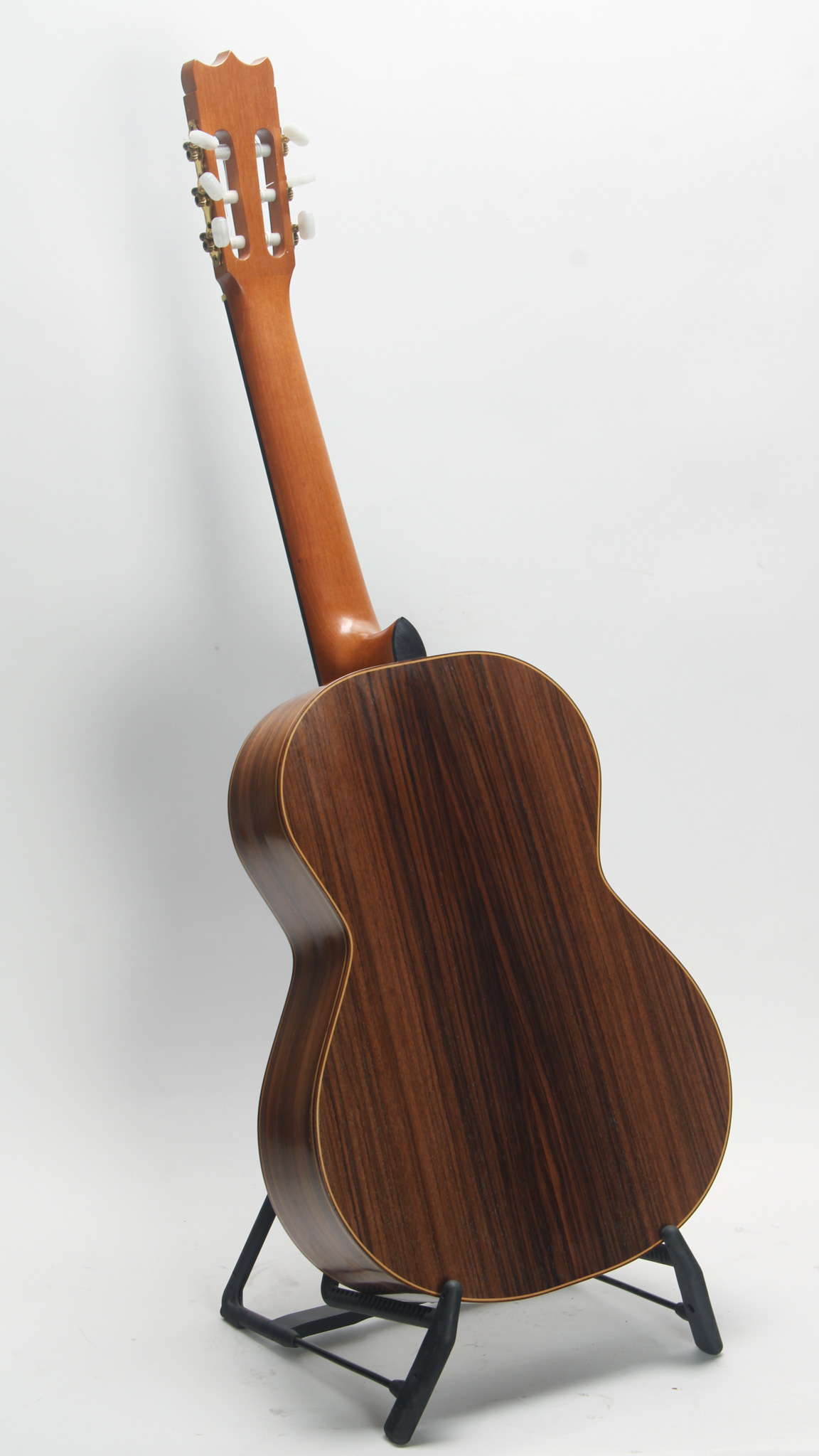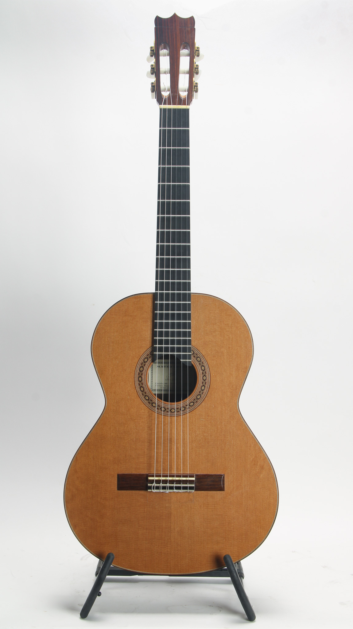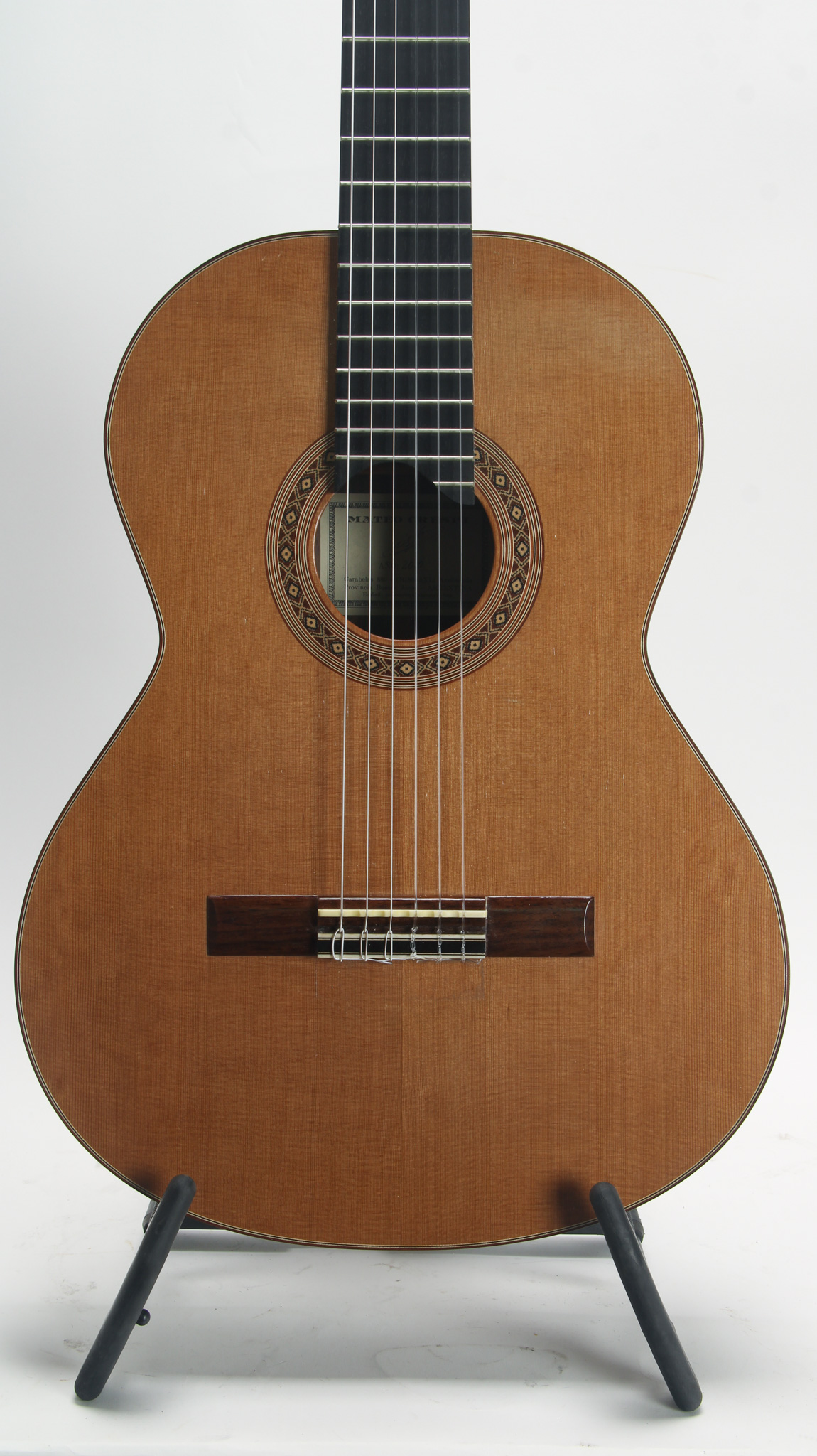 This guitar is constructed with a nice Red Cedar top with multi ply wood binding, and a solid tightly grained Indian rosewood back & side. Internally, it has Hauser style 7 fan bracing and kerfing that is solid at its base, slit only at the top. It has nice projection for a Cedar instrument (strung currently with high tension Savarez strings). Finished in French Polish, this instrument cosmetically has some blemishes but nothing too notable beyond surface level wear. The bridge is made of nice matching rosewood, with a unique scalloped bone saddle, standing tall with plenty of room for any needed adjustment.