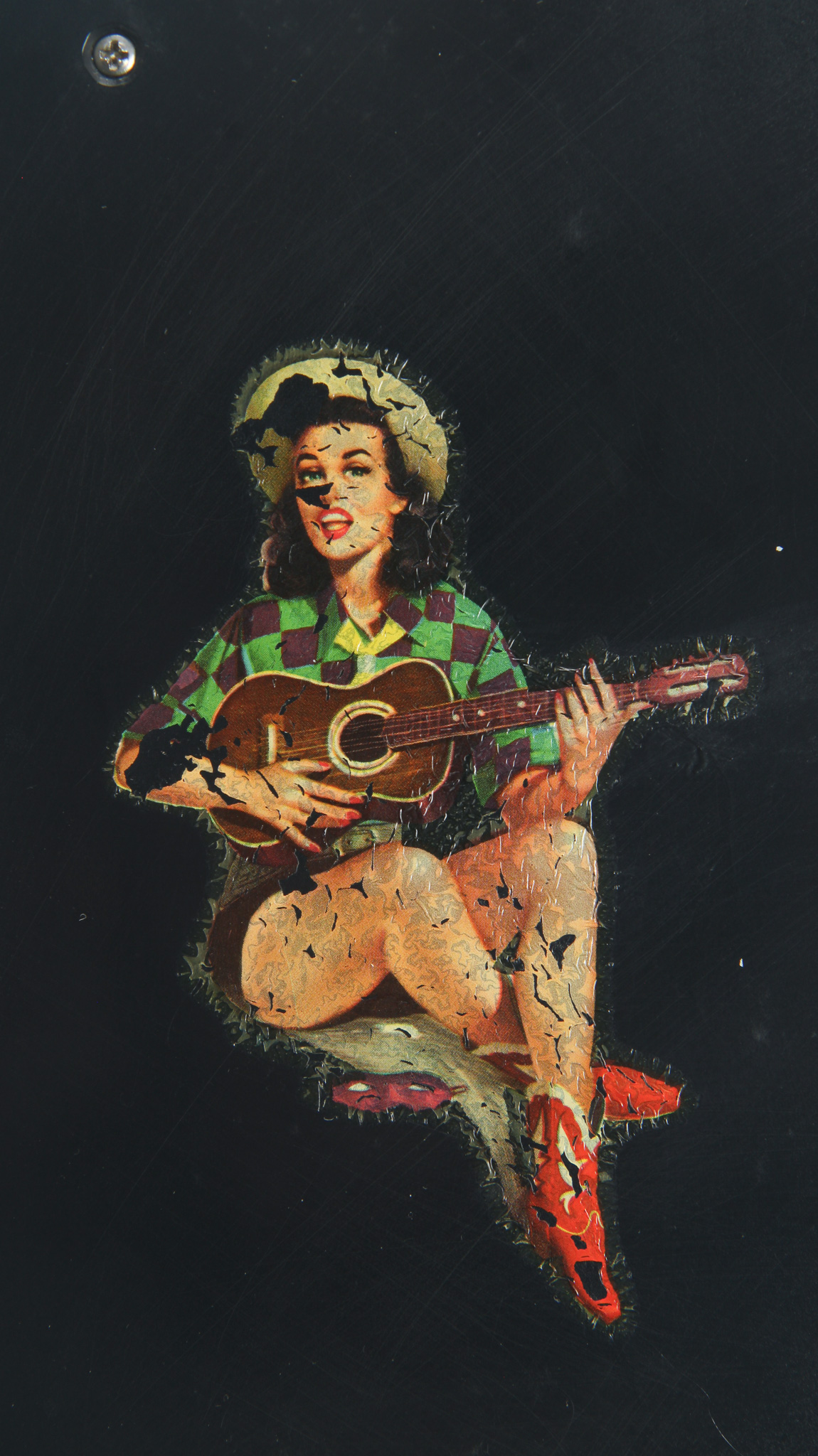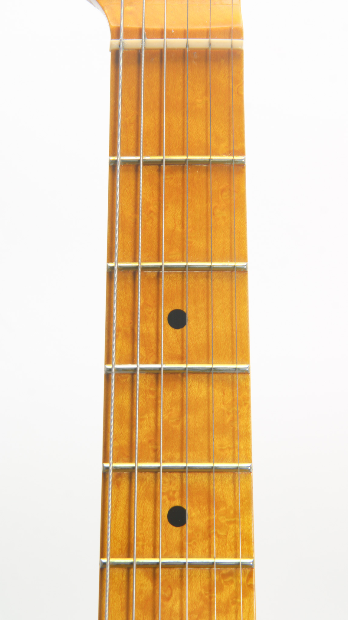 Branded "Nashville West" - named after the original band featuring White and Parsons - this one is numbered "44" in pen in its neck pocket - with no further identifiers. Iconic design, it features the 2.5" thick doubled body, with plastic cover on its back side with Cowgirl sticker (quite worn) - all covering up the Patent Numbered String Bender guard and B Bender system. According to it's neck stamp, the neck is from WD, complete with a nice soft V profile full of Birdseye. Copper foil currently obscures any internal body stamps otherwise.