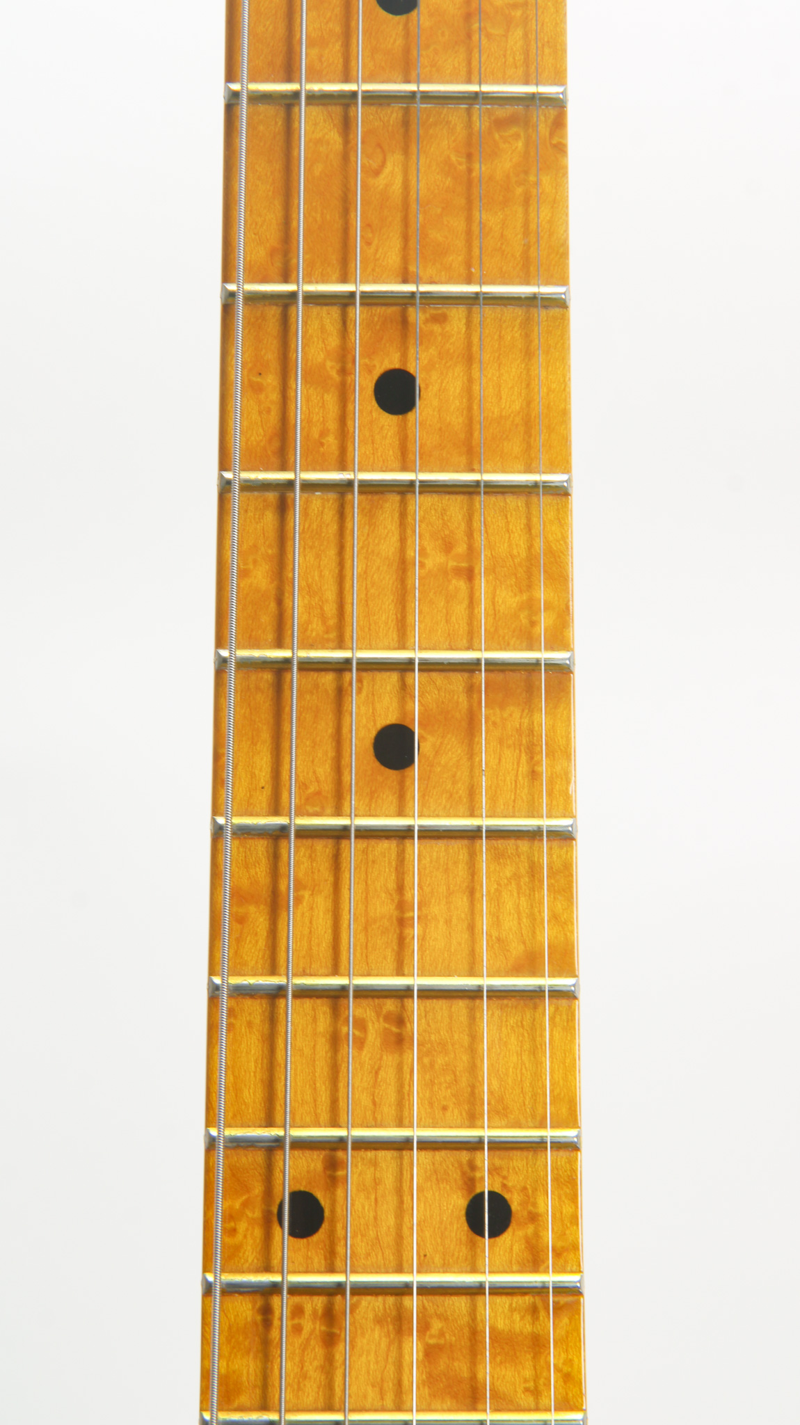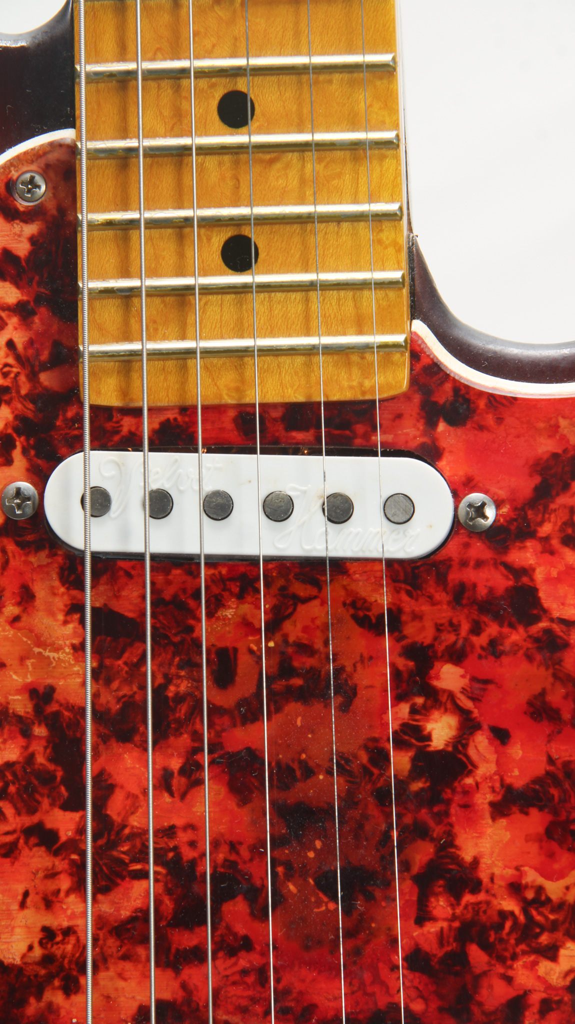 The body has a 60's standard burst finish, complete with two ply tortoise guard. Gold Fender stamped bridge with brass saddles present and looking good with little wear. The electronics shine on this instrument - complete here with two Red Rhodes Velvet Hammer single coils like that on Clarences. The bridge pickup, with three conductor out, the neck with two - this is equipped with a phase switch on a mini toggle between the volume and tone controls. The 4-way switch giving series and parallel options - this is a full fledged tone machine.