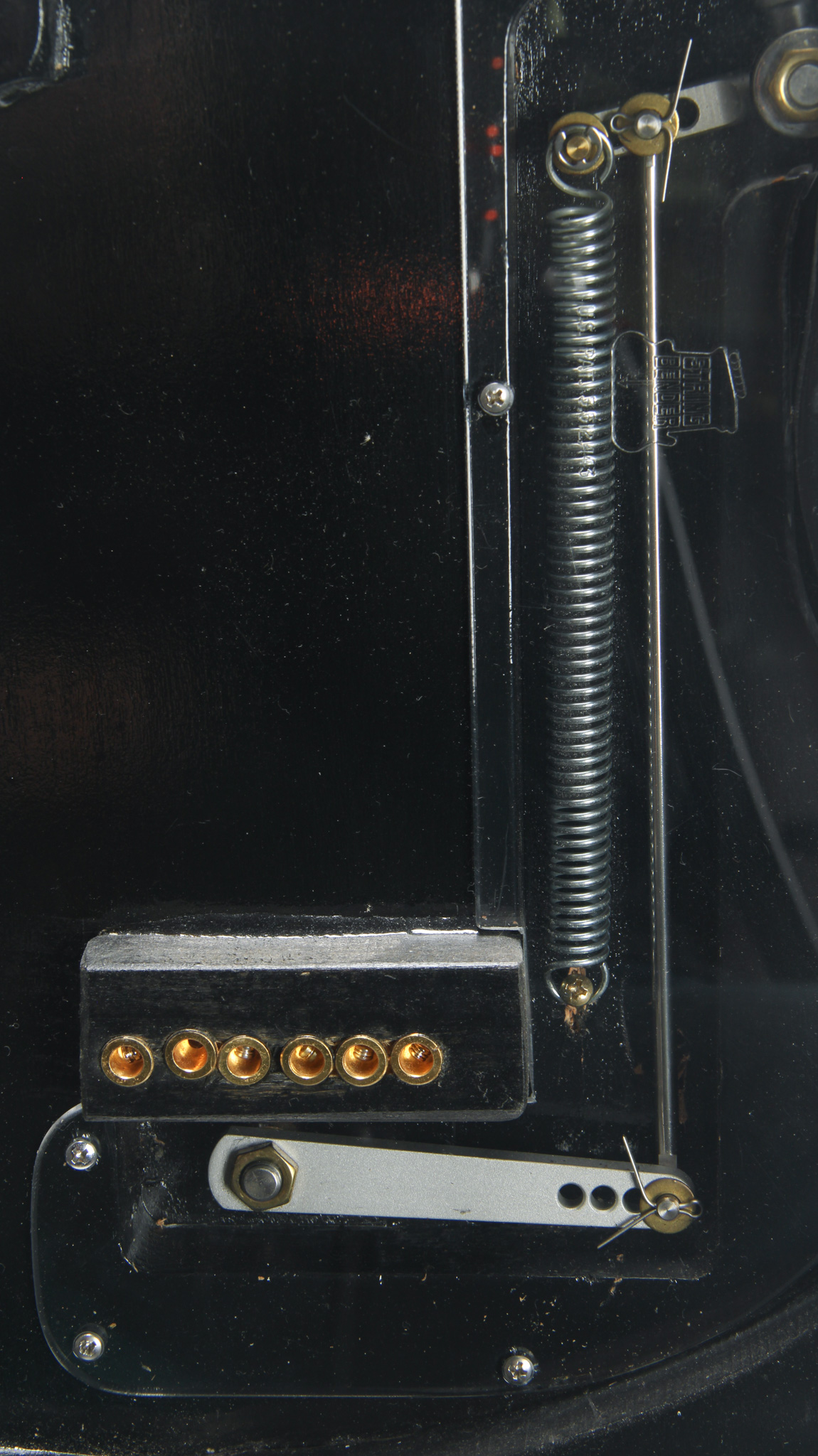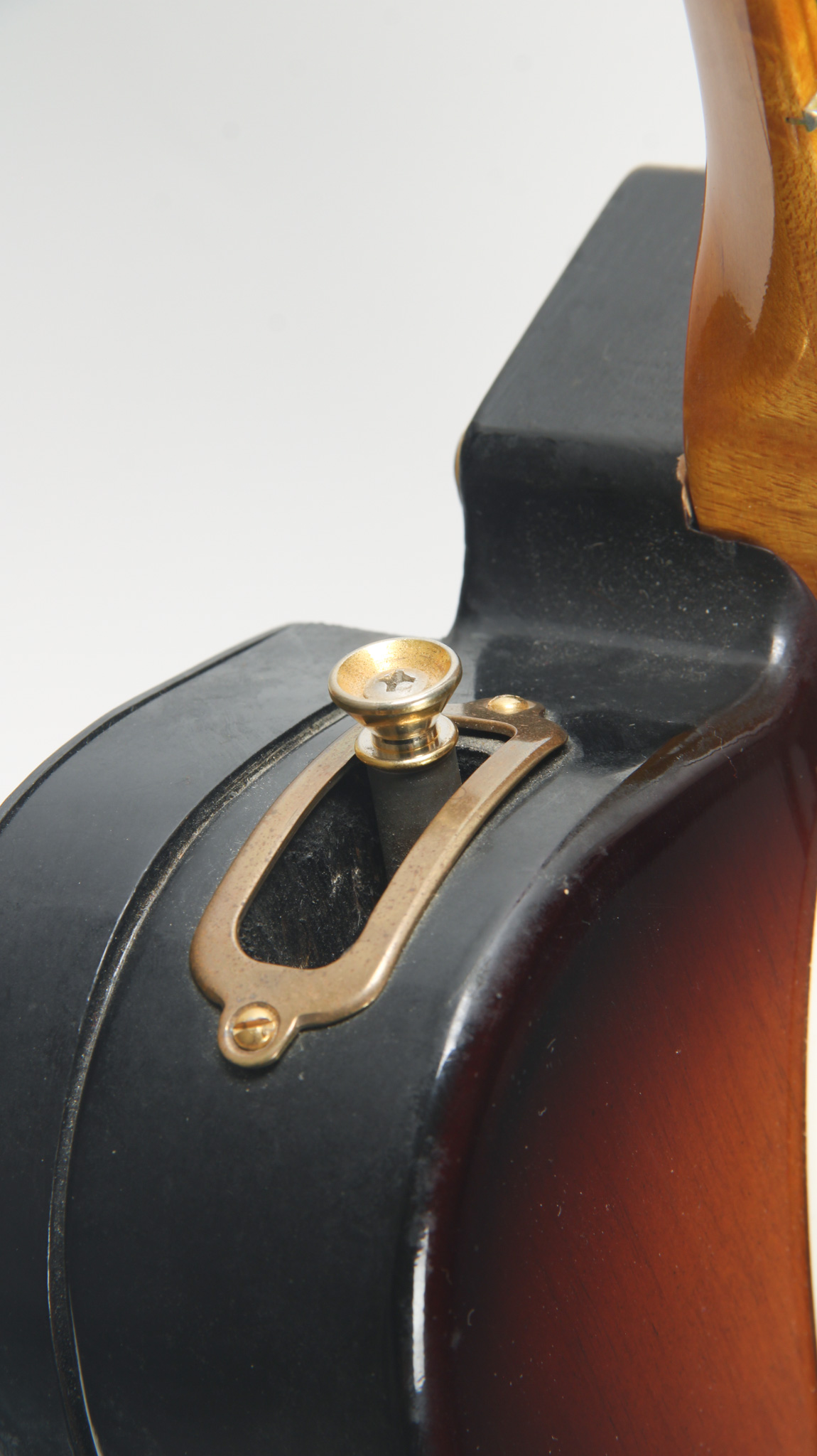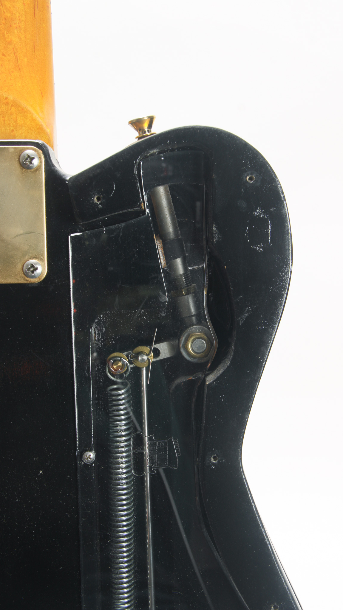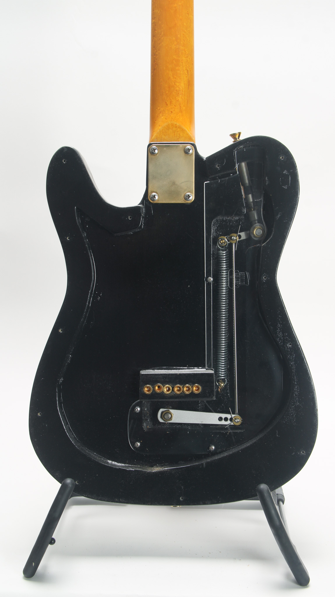 A stunning reproduction of the B Bender of Clarence White's guitar and built by the inventor of the B bender and fellow Byrds bandmate Gene Parsons. Pedal steel style bends are quite fun once the player gets used to adapting the strap tension for raising the B tuner a whole step.