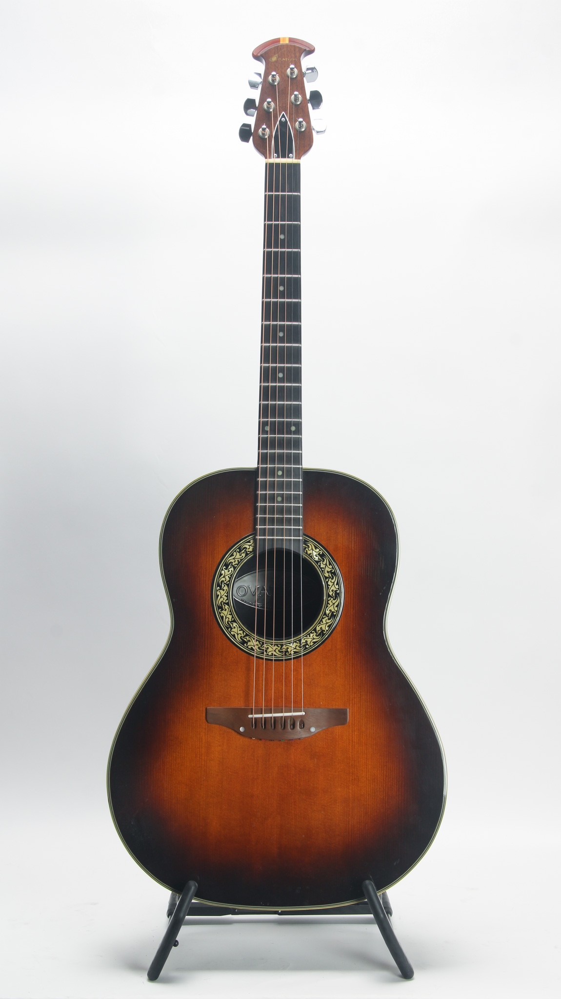 We always love a good Ovation - for real! A unique tone that can be associated quickly with the likes of Glenn Campbell, these are really song writing machines. The deep bowl Balladeer is a great vintage guitar that won't break the bank. A solid spruce top, seen here in the burst finish, it is in clean condition, crack and separation free. Clean multi ply binding and cool rosette, this one only has simple surface level wear present, and a bit of wear on the back of the bowl.