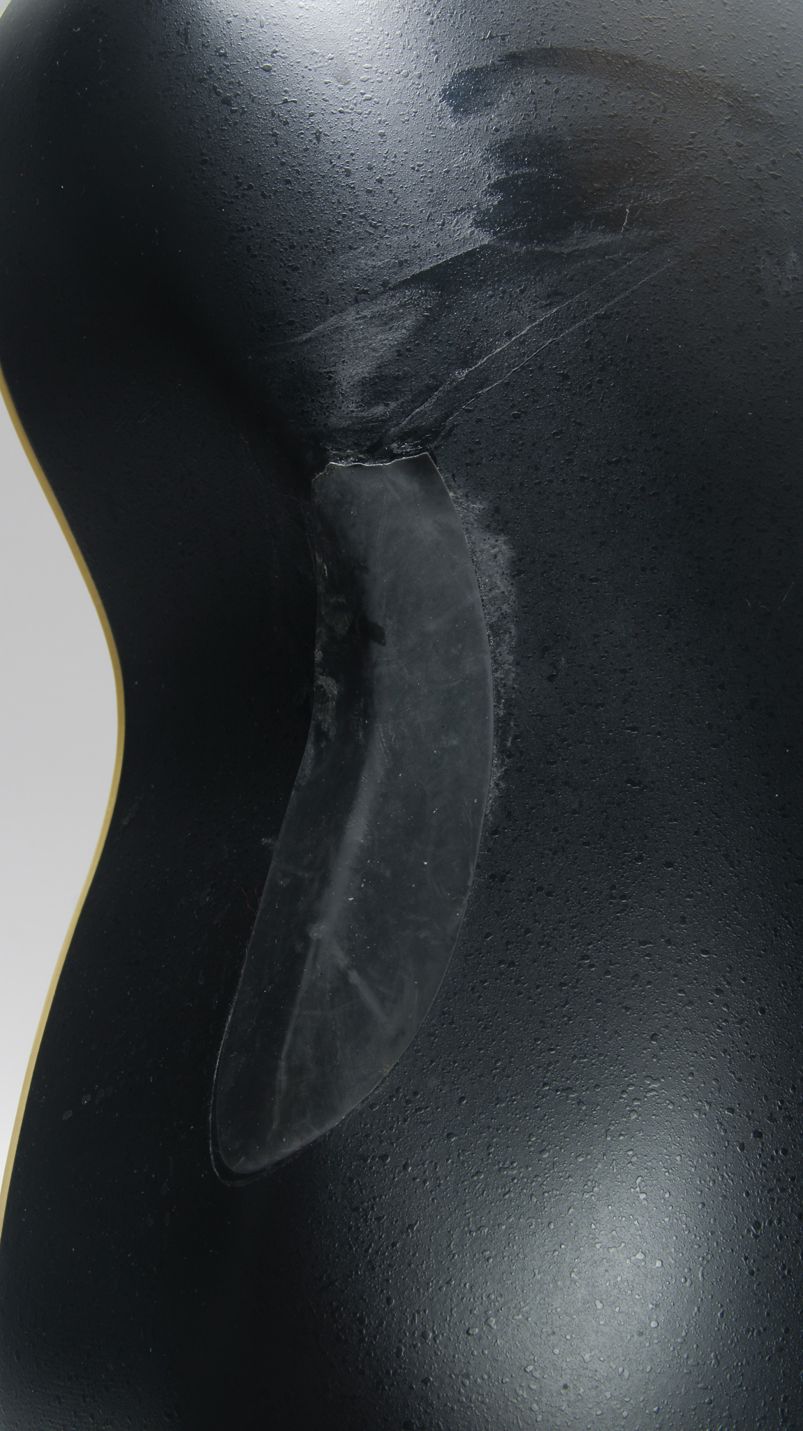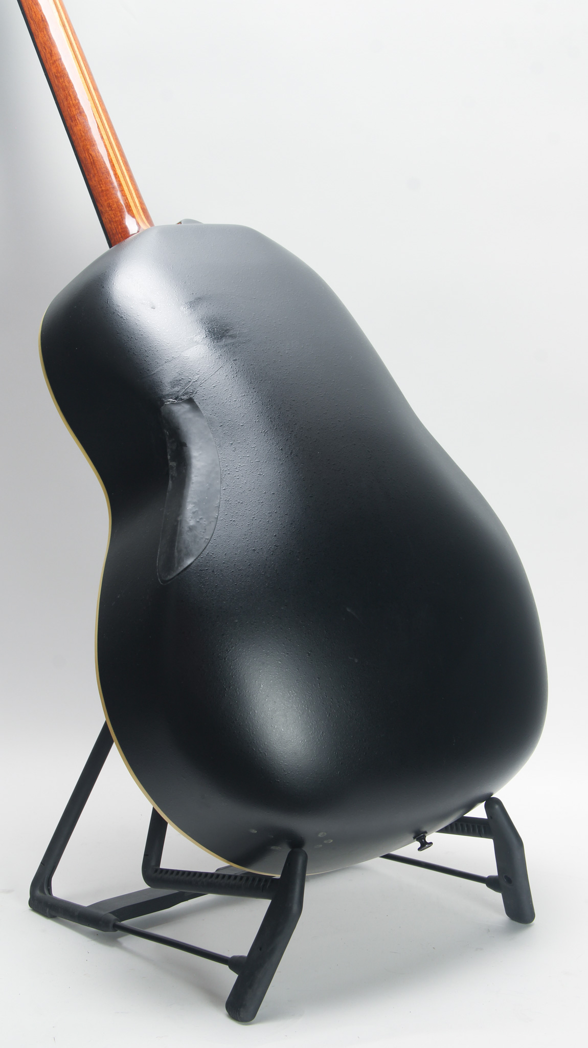 The neck is speedy and shows hardly any sign of use in its ebony fingerboard. The neck has a soft v profile, made with a multi ply mahogany, maple and rosewood skunk stripe. Standard 25.5" scale length, it has a 1 21/32" nut width, and measures .84" in depth at the first position, tapering up to only about .86" at the ninth. The frets and fingerboard are clean, and the action is low measuring about 5/64" in height at the twelfth fret.