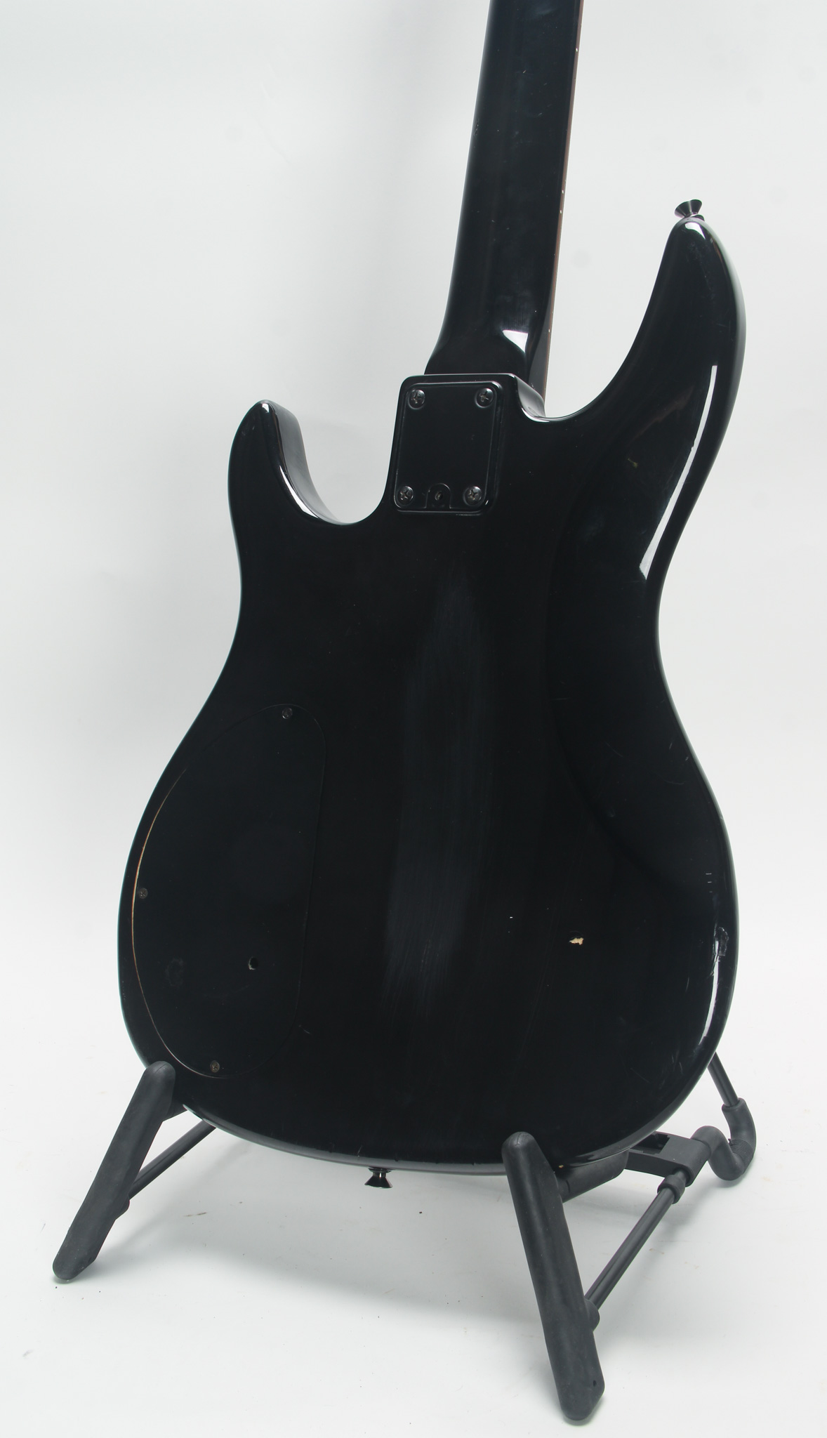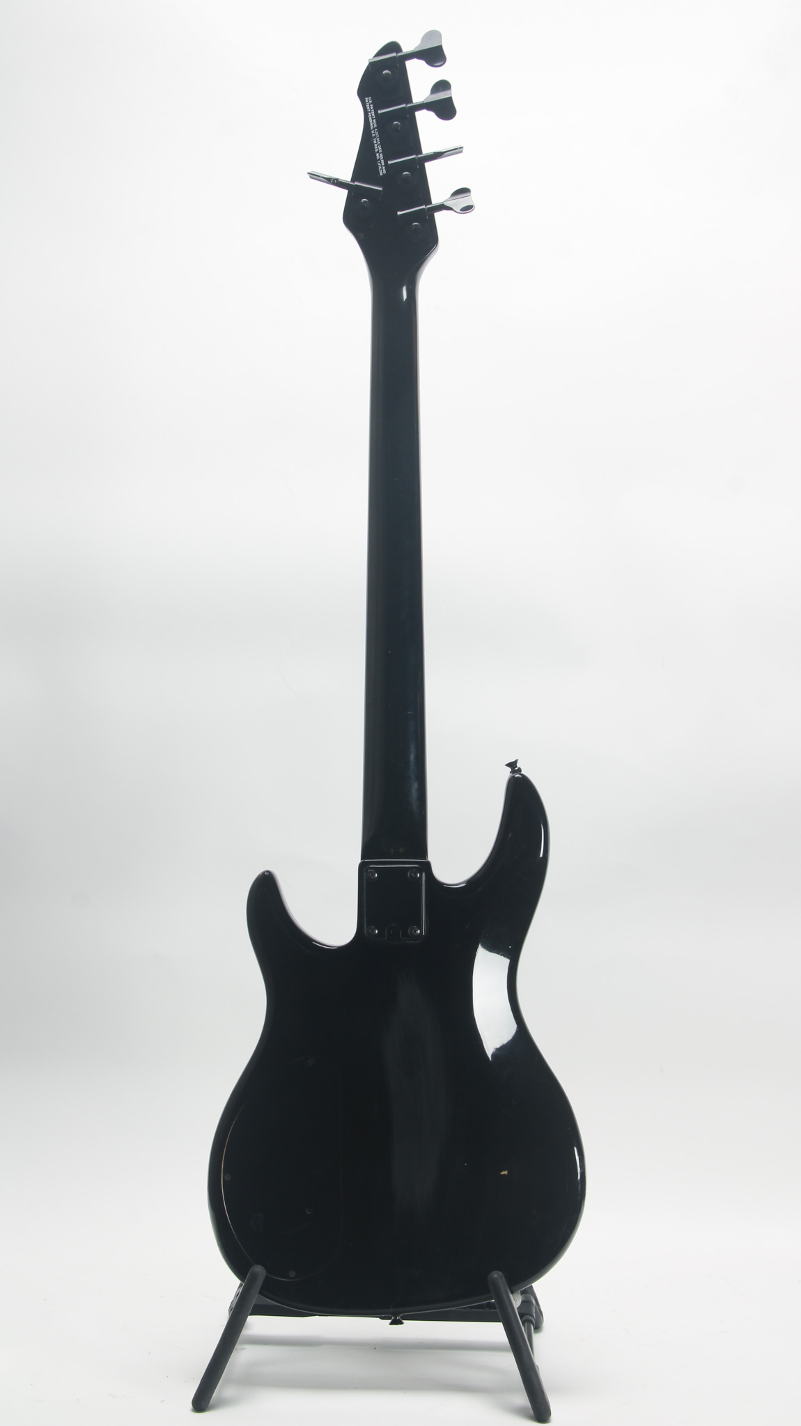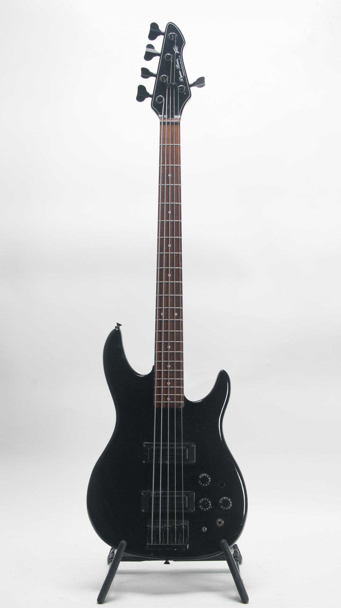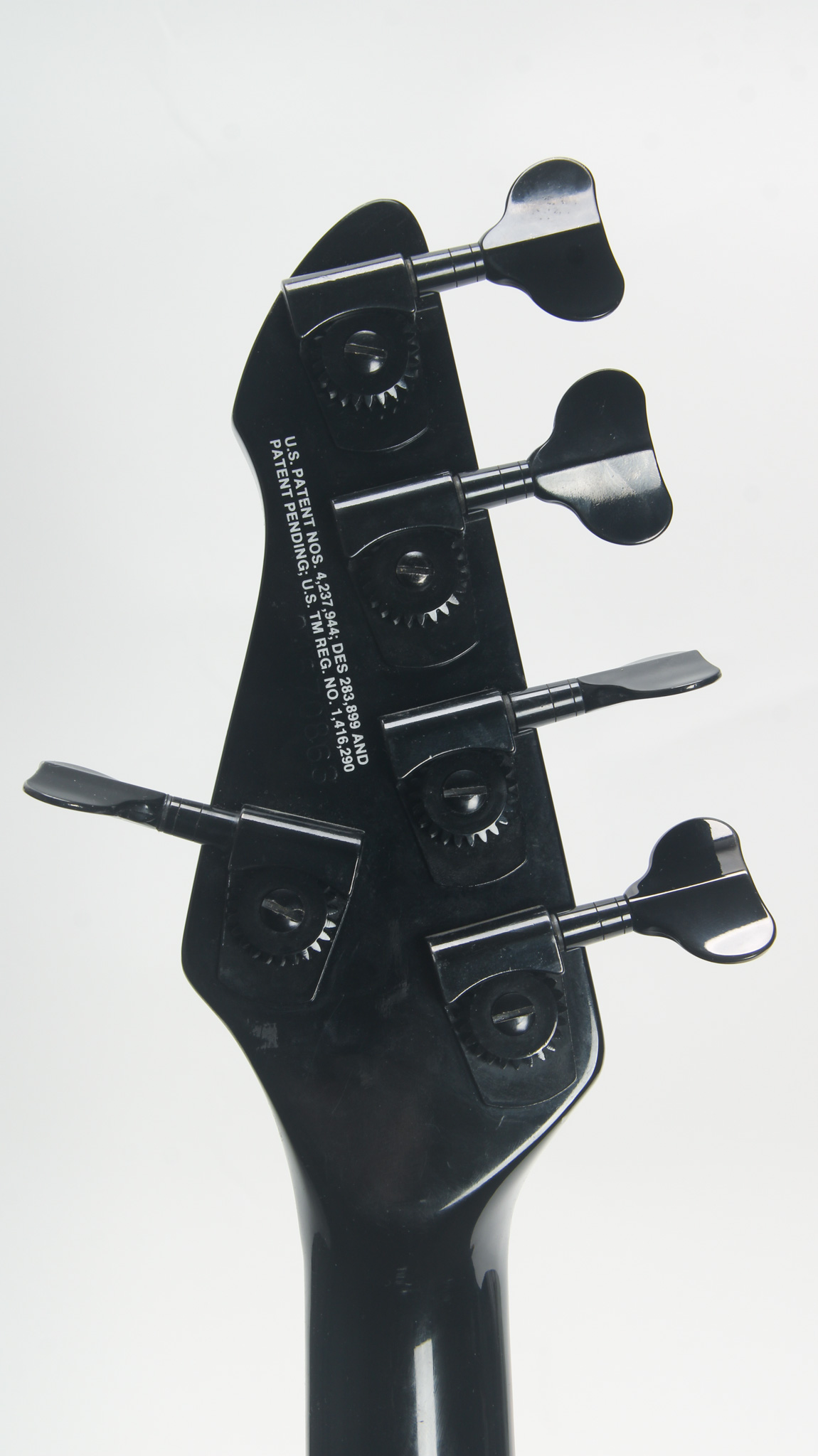 The Dyna Bass as seen here, is one such players instrument that is set to impress. Forever classic black finish could look great in a myriad of different settings. This one had its preamp removed, but the excellent sounding Bartolini produced Super Ferrite pickups remain. What was once two volumes with a three band EQ has been changed over to two independent volume controls with a master tone control (a bit subtle overall). One could call it a "Sklar" switch is present - totally disconnected from the circuit. The output jack has been moved to its front by the previous owner, but one could install it back to its side profile if desired. High grade, high mass bridge has stayed flat, the saddles still strong providing good intonation. Cosmetically, this example has its bit of wear, primarily some scratches and dings on its back side.