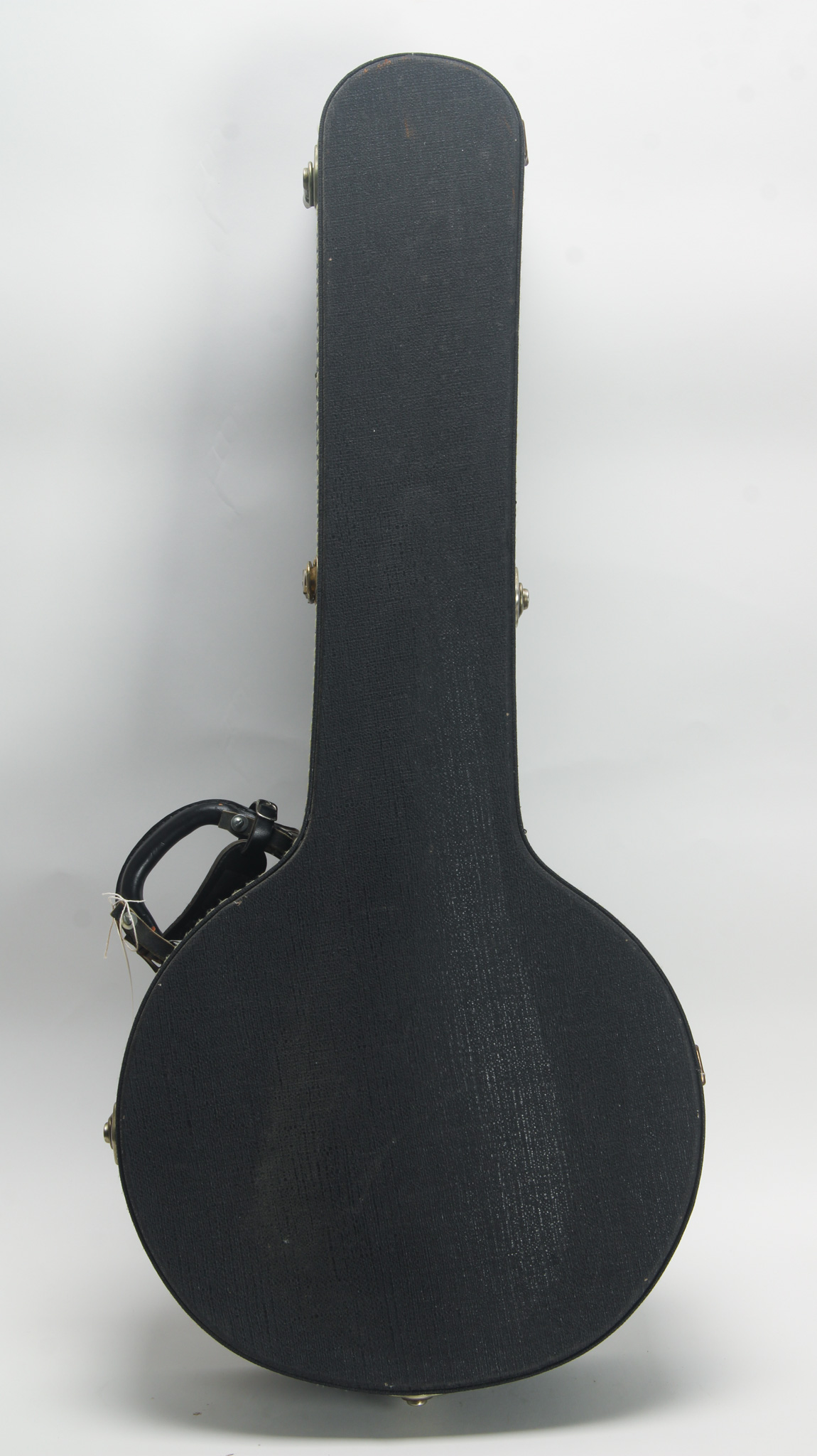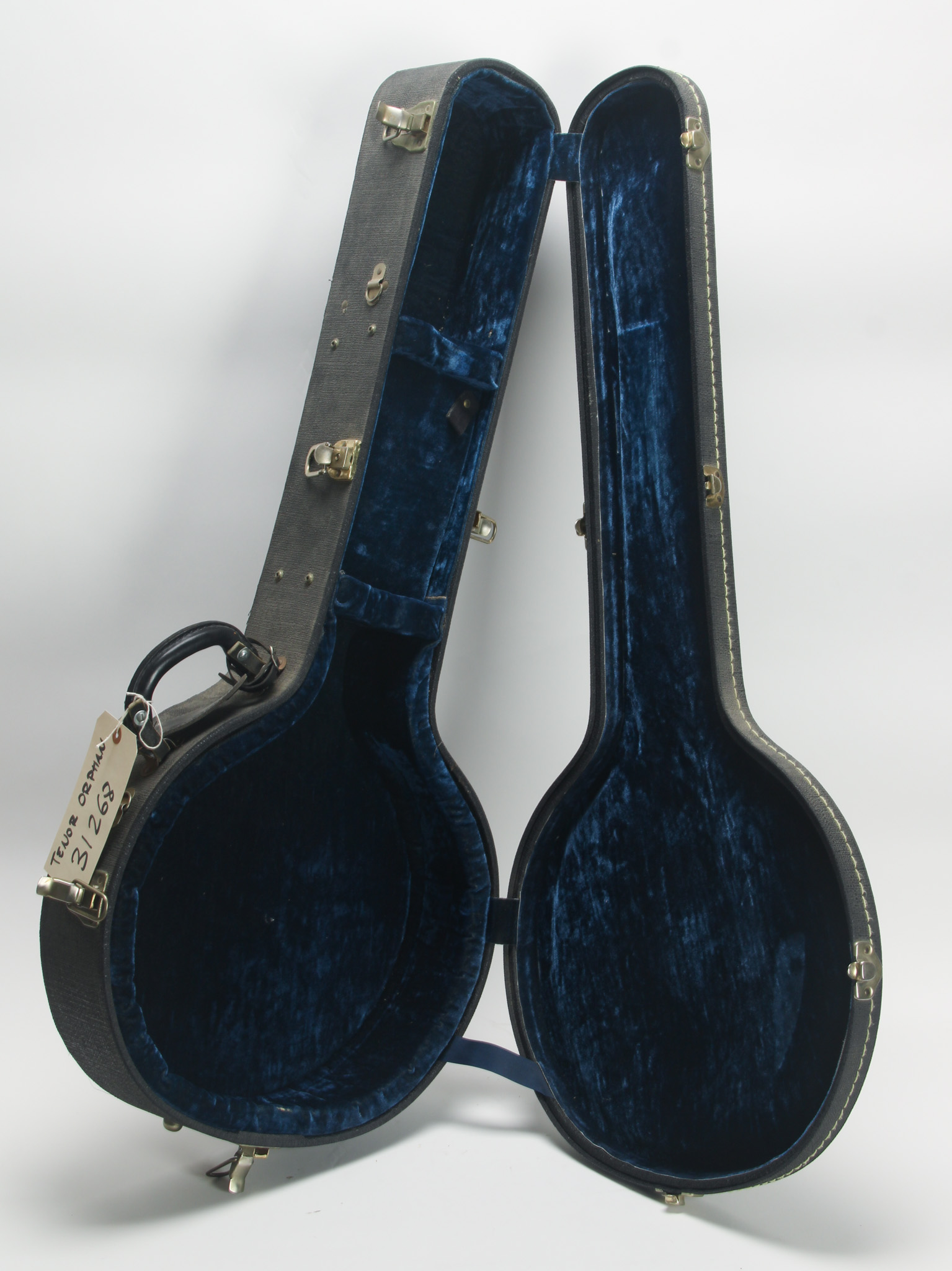This is a USED unmarked tenor banjo hardshell case with 5 latches. The interior is a crushed blue velvet. It appears as though the handle was replaced at one point. The current handle is leather and very sturdy.