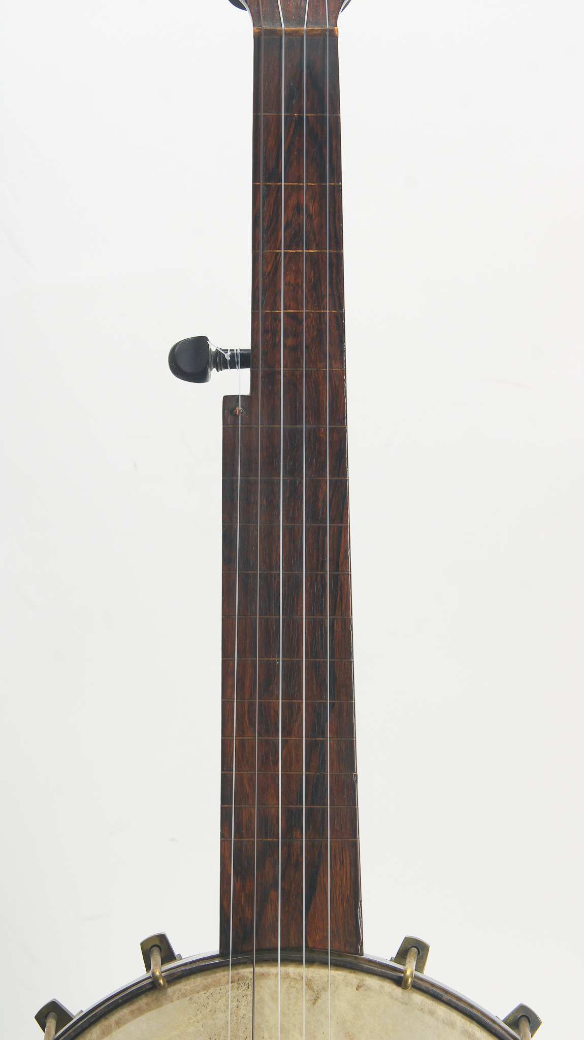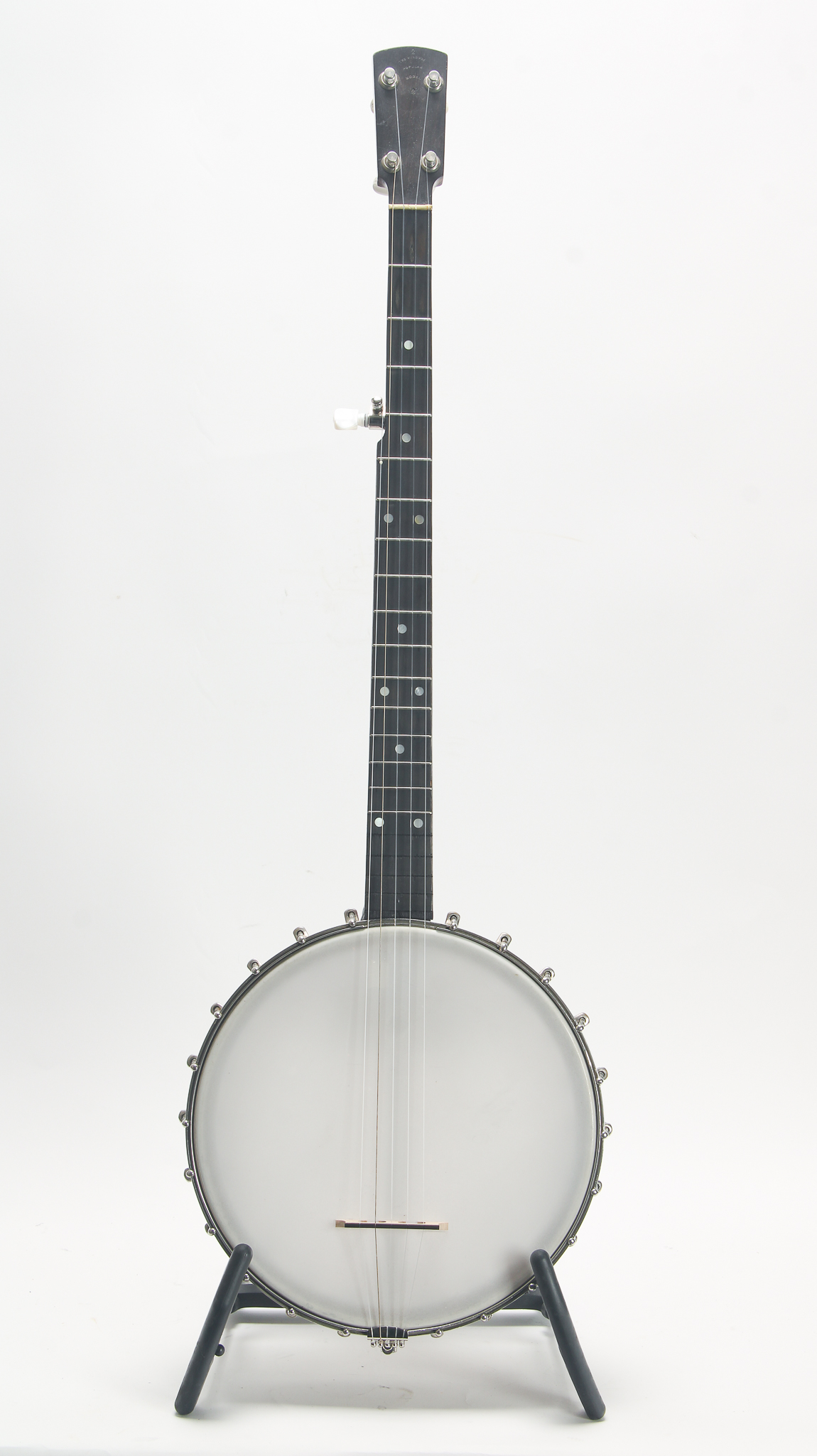 Non-traditional marriage of a deep Washburn pot, and a Windsor neck, a trans-Atlantic love story for the ages. The 10-3/4" diameter rim was made with birdseye maple, has nearly a 3" depth, with a rolled tonering; hardware appears original, repro tailpiece. The mahogany neck bears the Windsor stamp on the peghead, has a 27' scale ebony fingerboard w/ newer frets; forward relief and some twist present, but a a nice player, good tone., Setup with nylon