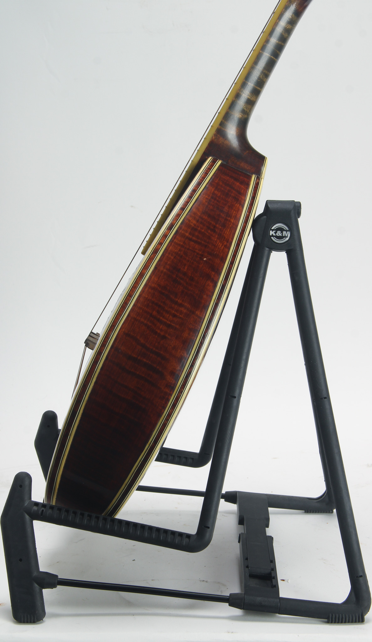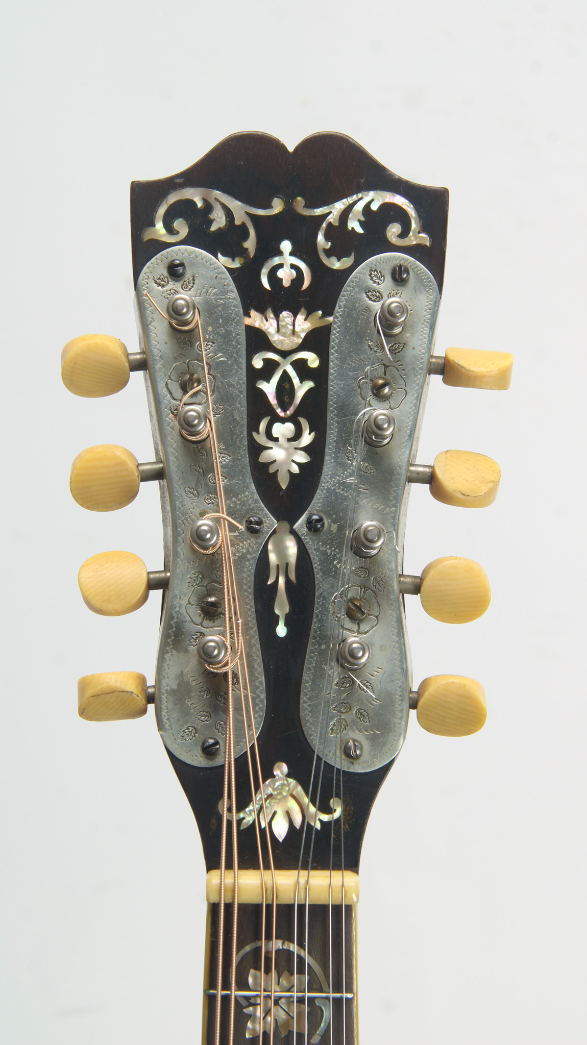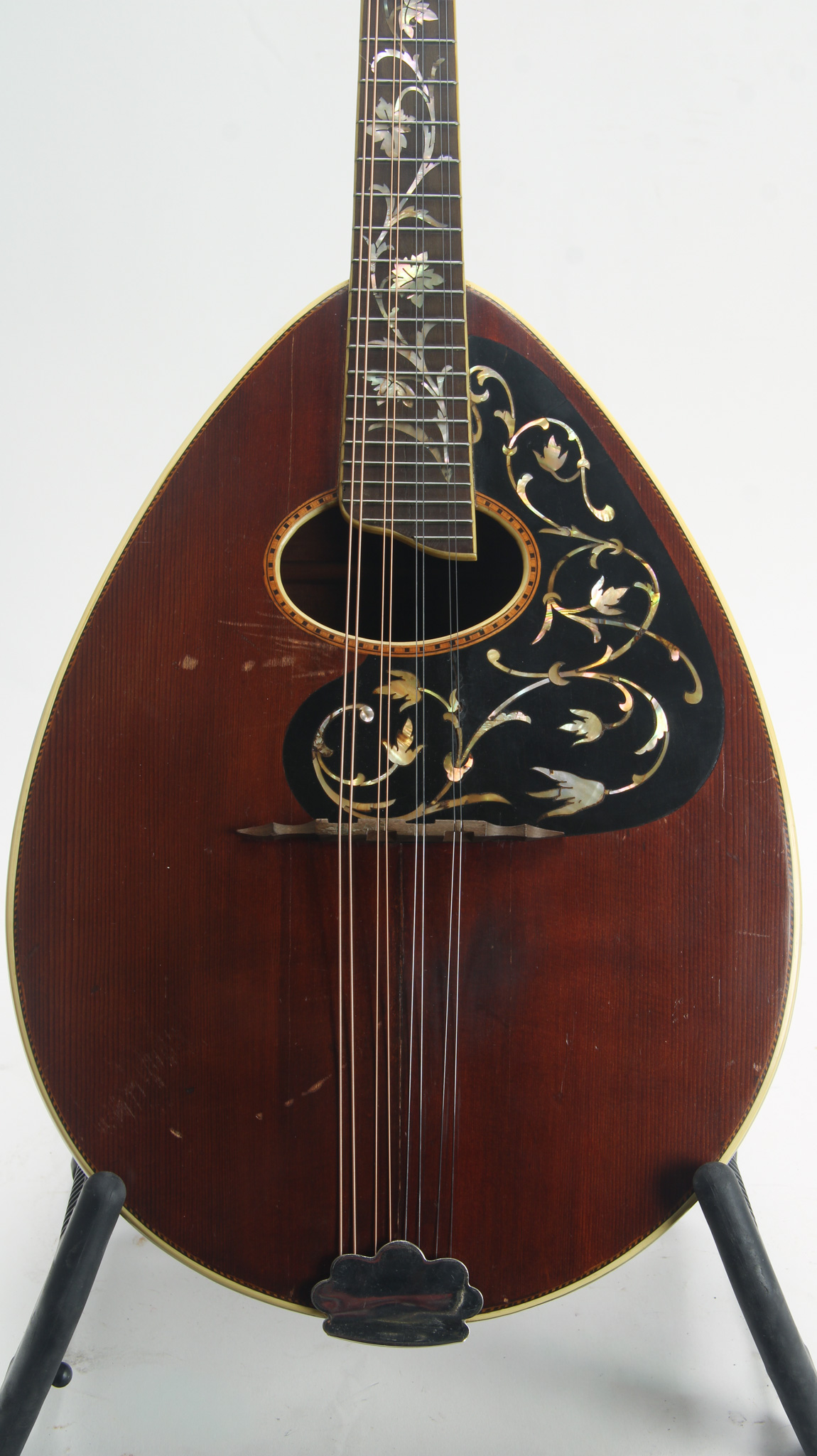 The highest grade Mandolute offered from Philadelphia's Weymann and Sons, essentially a large bodied, tear-drop shaped mandolin family instrument with tapered depth, flamed maple construction with finely grained spruce top, finished in a chestnut hued brown. Selling originally for $75 (close to $3k in today's dollars), the uniquely shaped body is chamfered and bound on all edges, with multiple laminations and trimmed on the top edge with a delicate herringbone pattern; inside, there a system of horizontal scalloped cross braces on top and back, with an inset pickguard with inlaid pearlwork, with Waverly cloud tailpiece, bound oval sound hole trimmed with small block marquetry; reglued top cracks present including center seam, cosmetic wear and typical hairline cracks present on guard; blue Weymann label present inside. The three piece flamed maple neck has a bound pearwood fretboard with long pearl vine inlay, 1-3/16" wide bone nut, gorgeous pearl inlay on the peghead overlay, with engraved recessed geared tuners, and golden Weymann shield logo on reverse in silkscreen; thin original frets have some pitting with hairline grain separations to pearwood fingeboard, but a nice playing instrument with tons of unique warmth!